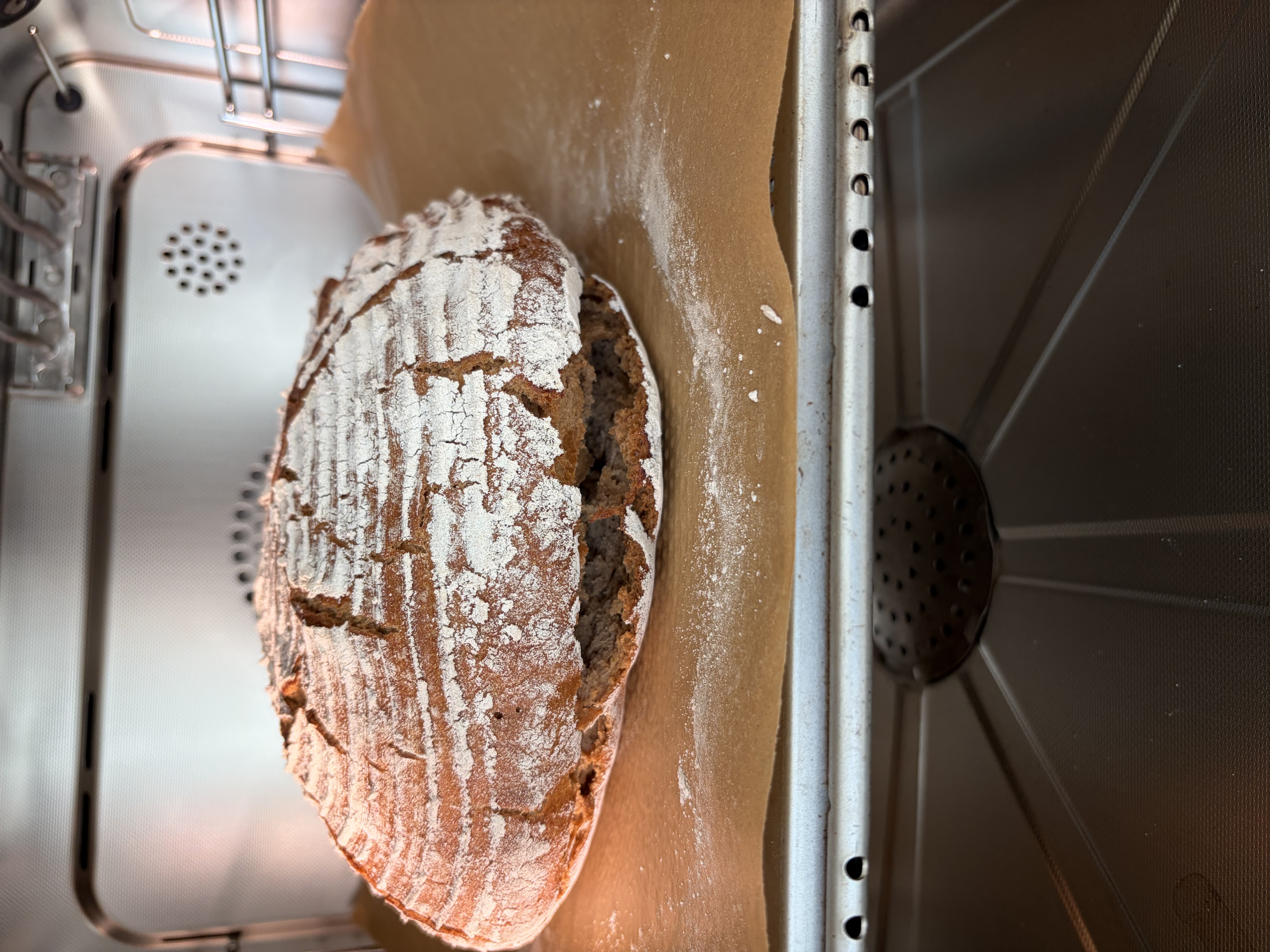 Eingeschossen habe ich mit Backpapier & Schwaden, das Backpapier hat sich dann auch im unteren Bereich an das Brot gelegt, als es unten aufging.