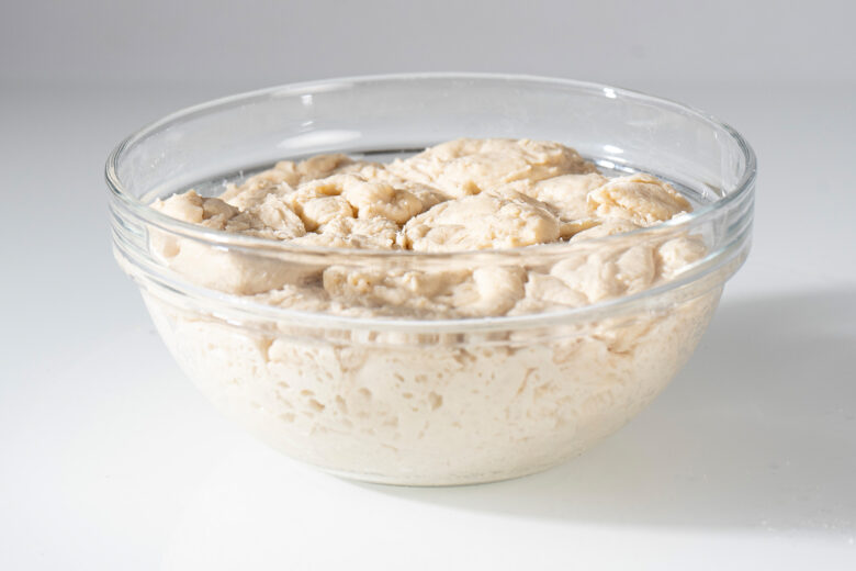 - Vermischen: Die Hefe in das Wasser einrühren, bis sie vollständig gelöst ist. Anschließend das Mehl hinzufügen. Mische die Zutaten grob zusammen, bis eine einheitliche Masse entsteht. Es ist nicht erforderlich, den Teig intensiv zu kneten oder eine Glutenstruktur aufzubauen.