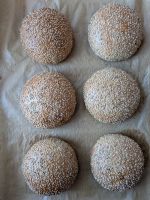 Wenn die Teiglinge halbe Gare erreicht haben, werden diese mit der flachen Hand leicht angedrückt und mit Wasser bestrichen. Das ganze Stück in Sesam legen und zur weiteren Gare auf ein Backblech ablegen. Nochmals zugedeckt an einem warmen Ort auf die Gare stellen (die Gare kann auch bei 4°C für 10 Stunden erfolgen).