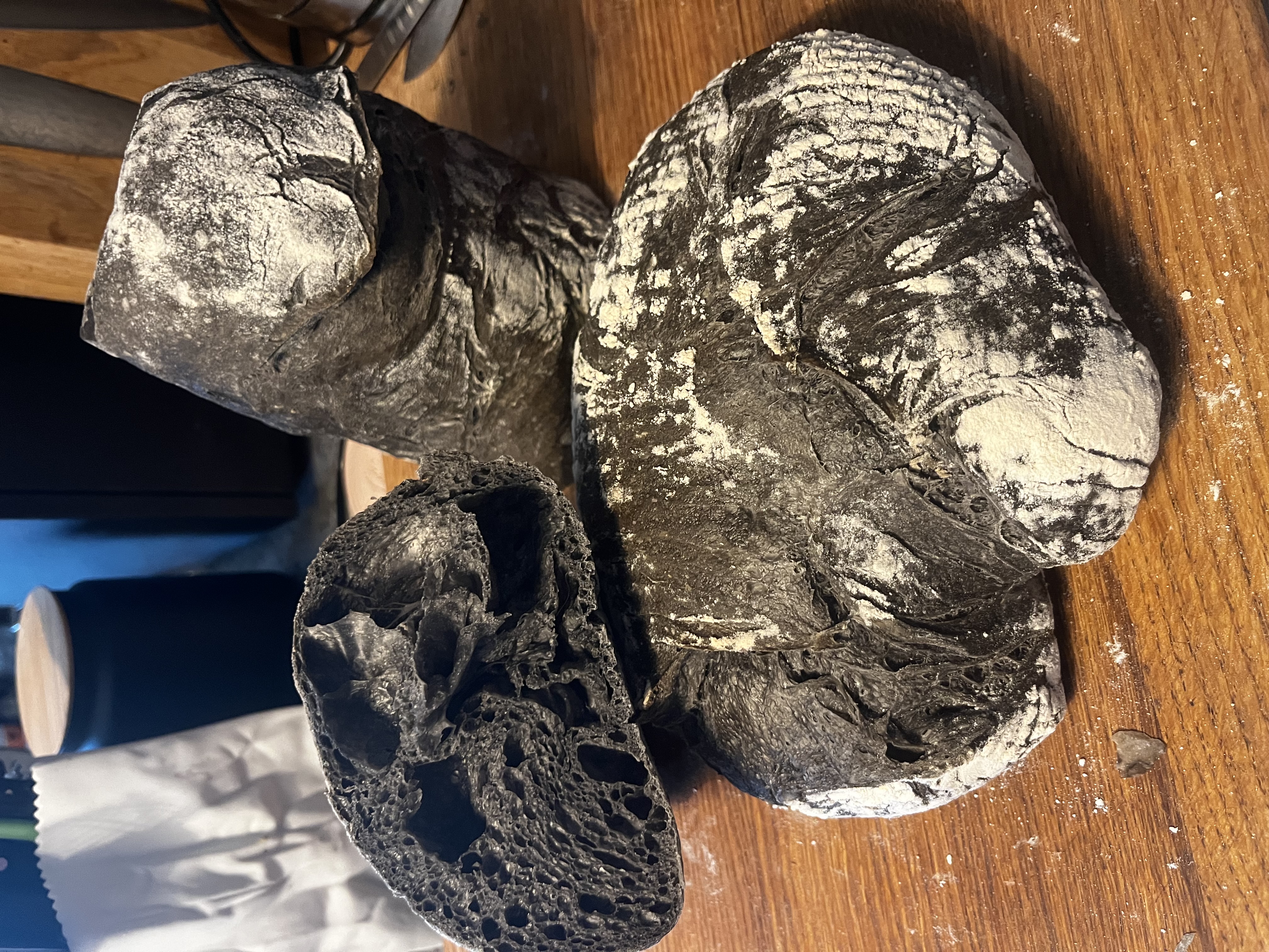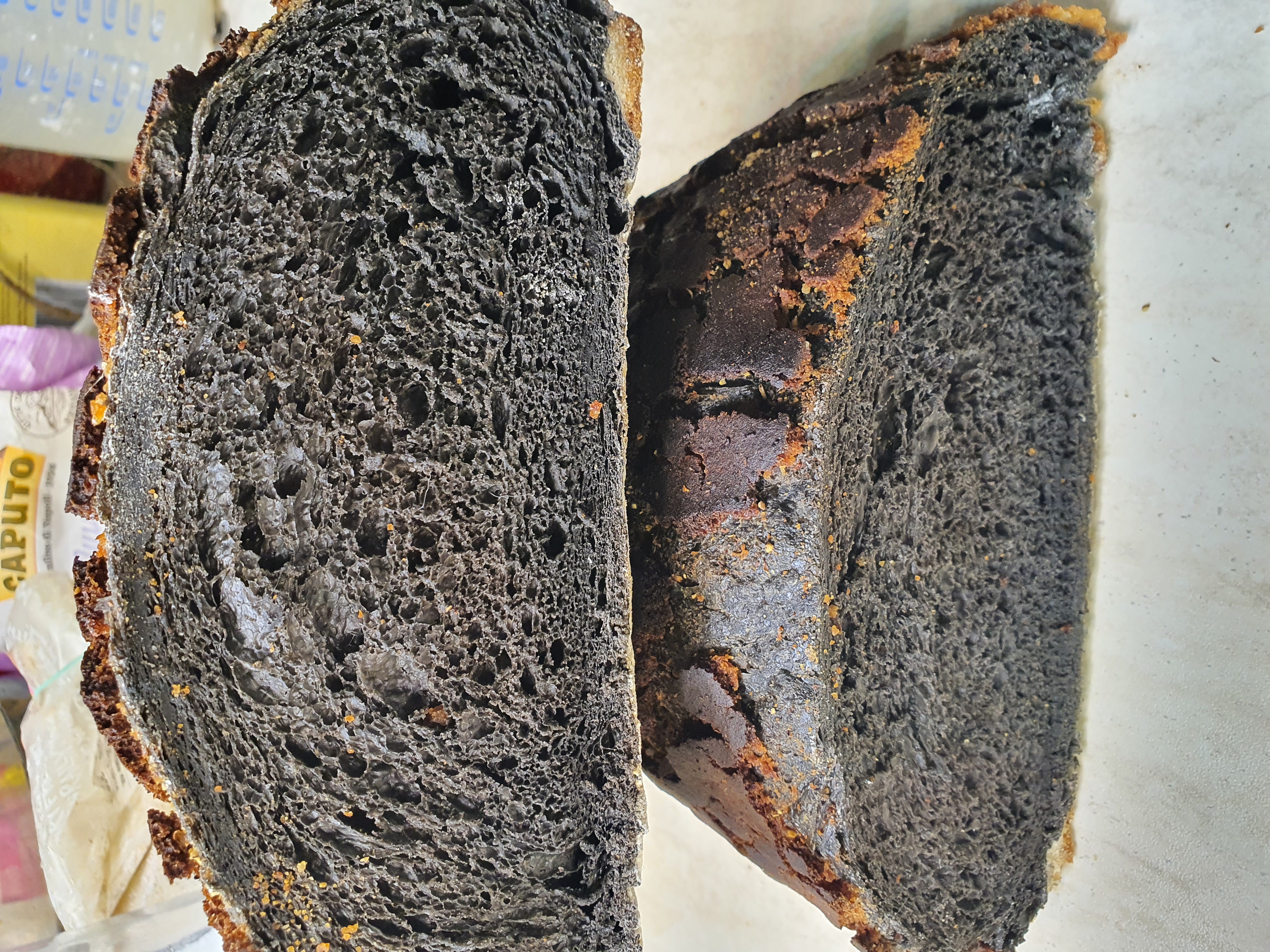 Sein besonderer Charakter entsteht durch die Färbung mit Sepia. So bekommt die Krume eine tiefschwarze Farbe, während das Innere locker und saftig bleibt, mit einer offenen, leicht glasigen Porung. Beim Backen reißt die Kruste auf und bildet ein wildes Muster, das an die Spur eines Kometen erinnert.