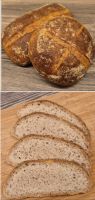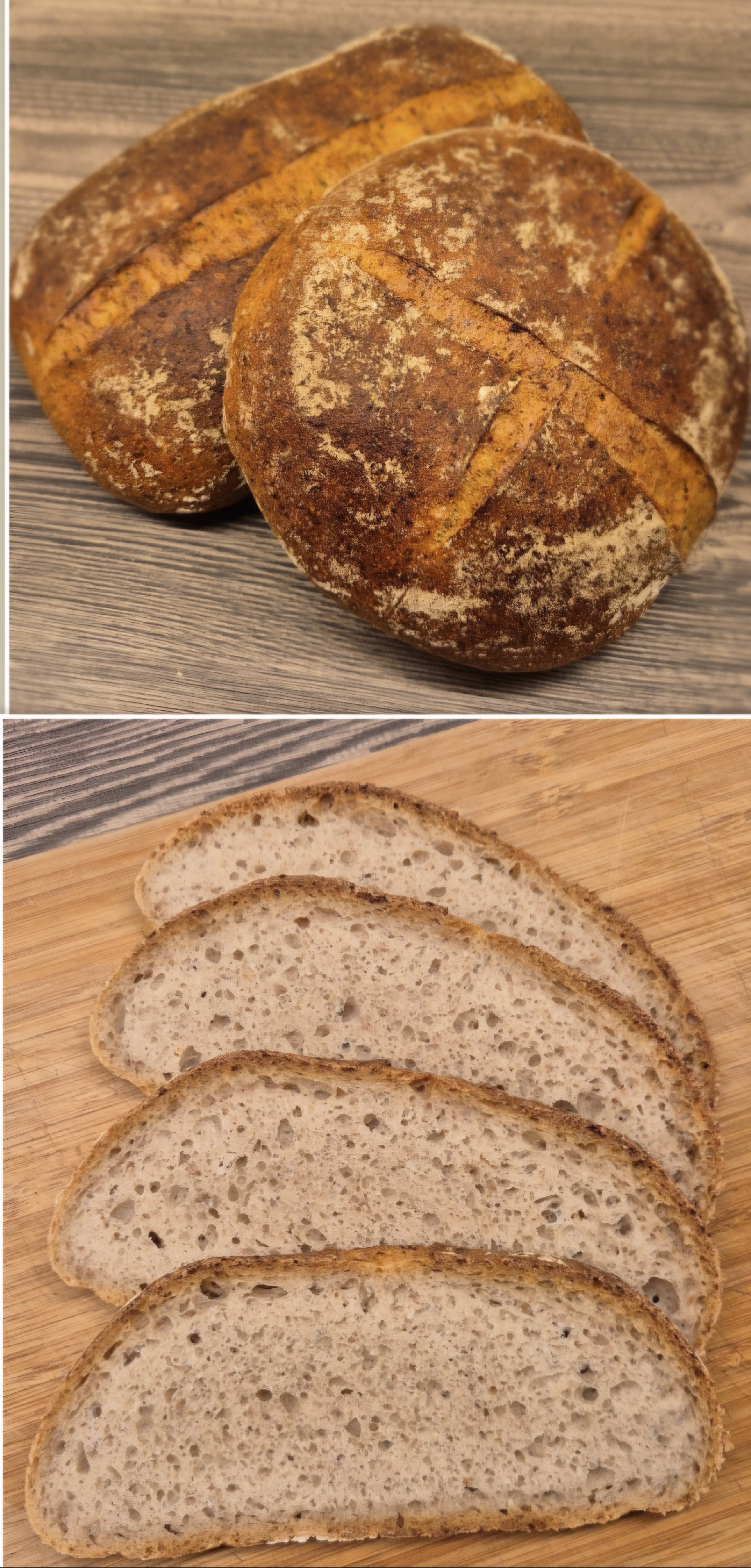 Zwei Brote, eines mit 600g, von dem stammt das Bild. Das große Brot mit ca. 1200g ist bereits aufgeschnitten im Gefrierfach gelandet. Das kleine Brot existiert nicht mehr, das musste heute zum Frühstück dran glauben.