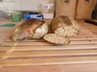 Dieses Brot hat wirklich Potential zu einem Lieblingsbrot! Schon der Teig liegt so toll in den Händen beim Falten und entwickelt sich im Kühlschrank super. Evtl hab ich bei der Aufarbeitung zu viel Spannung drauf gebracht, weil es trotz 17 Stunden im Kühlschrank nicht ein wenig breiter geworden ist. Es schmeckt auf jeden Fall wunderbar und hat überhaupt keine Säurespitze!