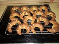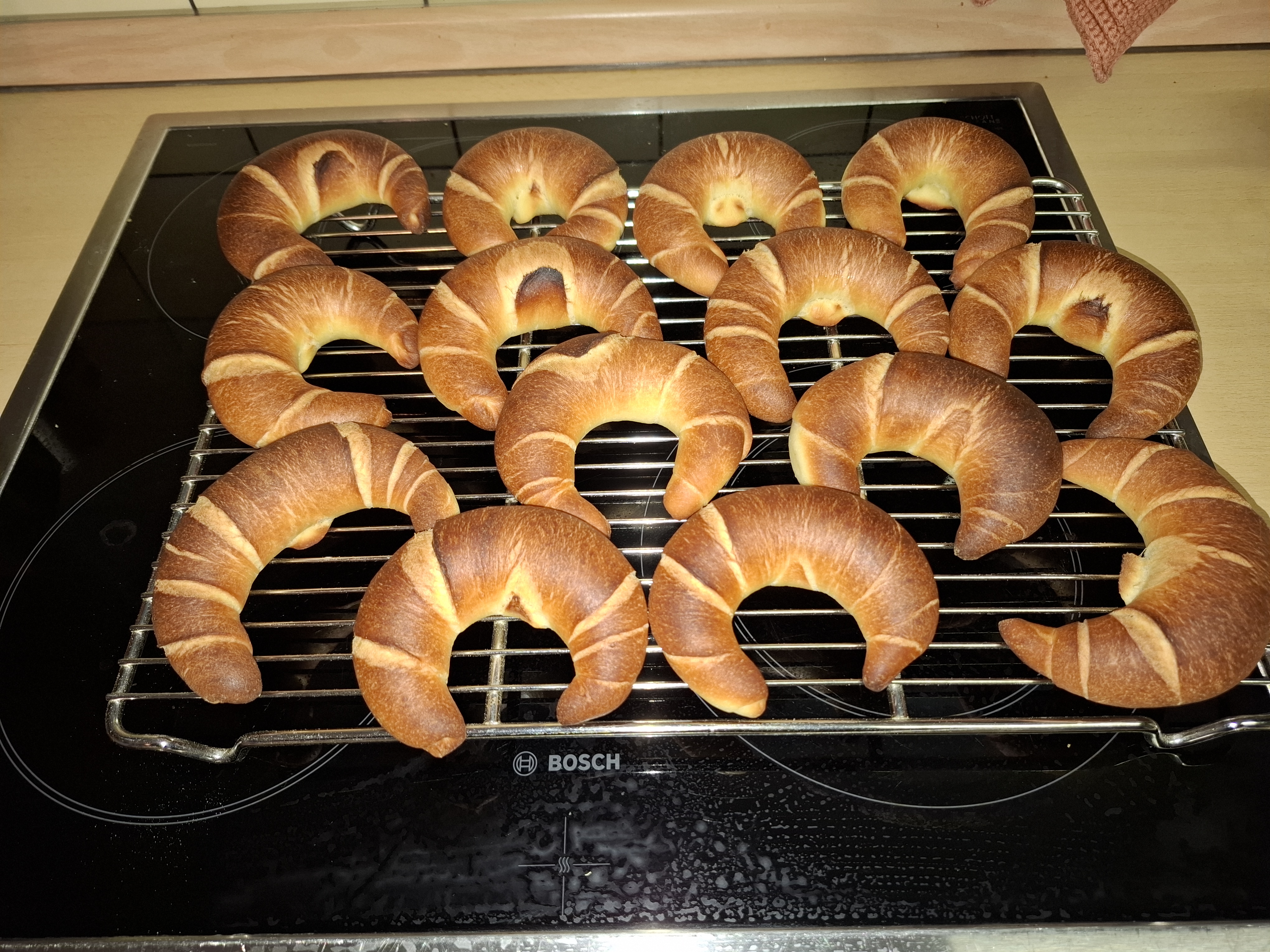 Ich habe es mit Kipferl begrüßt. Dabei habe ich mal – wie im Backkurs gesehen und auch von Marcel Paa empfohlen – ein umgekehrtes Backblech zur Backraumverkleinerung verwendet. Nach halber Backzeit habe ich es rausgenommen. Die Kipferl sind super aufgegangen, aber der Ausbund ist etwas verschwommen. Naja, geschmeckt haben sie sehr gut 🙂