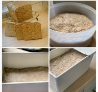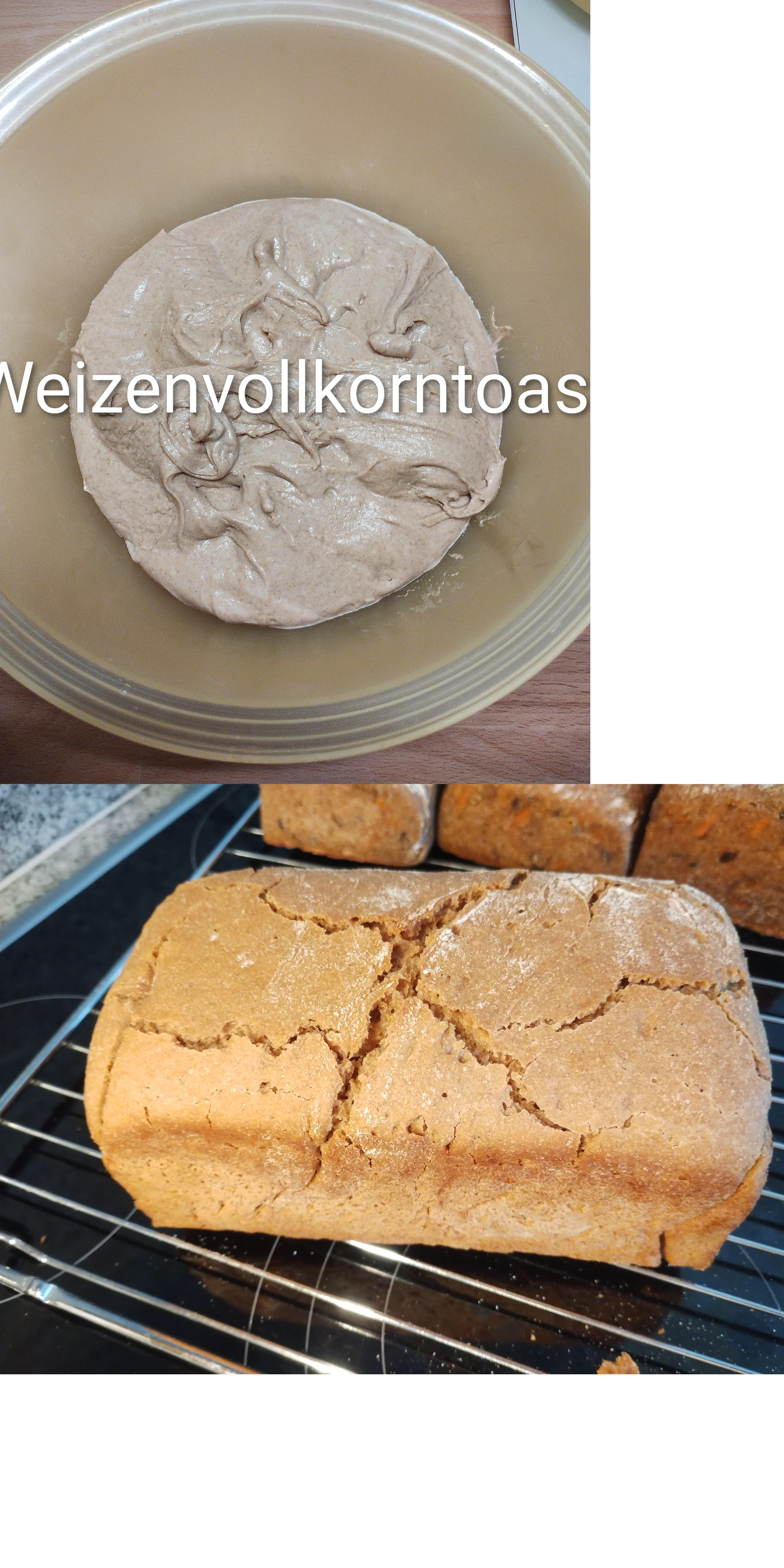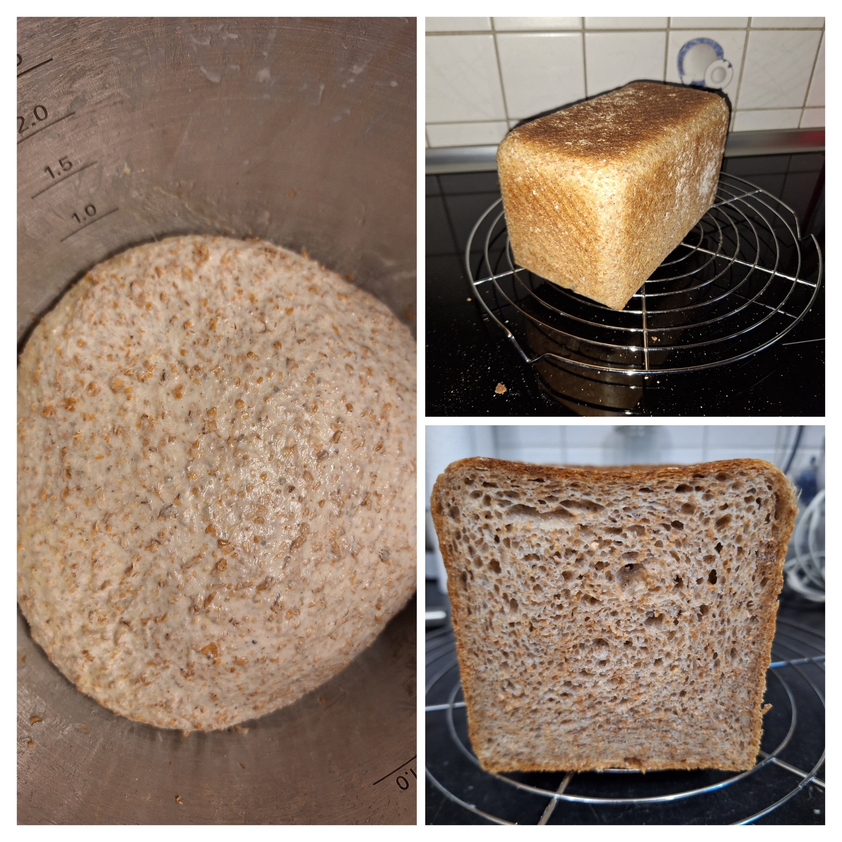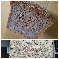 jetzt noch der Weizenvollkorntoast. Für eine Toastbackform hätte ich wohl mehr als die Hälfte der Menge nehmen müssen. Nächstes Mal mit 0,65 facher Menge.