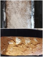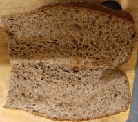 Hier noch ein Versuch des Dachsteinbrotes. Anschnitt war noch im warmen Zustand. Wirkt so, als hätte es in der Stückgare noch länger reifen dürfen. Aber trotz allem geschmacklich sehr lecker.