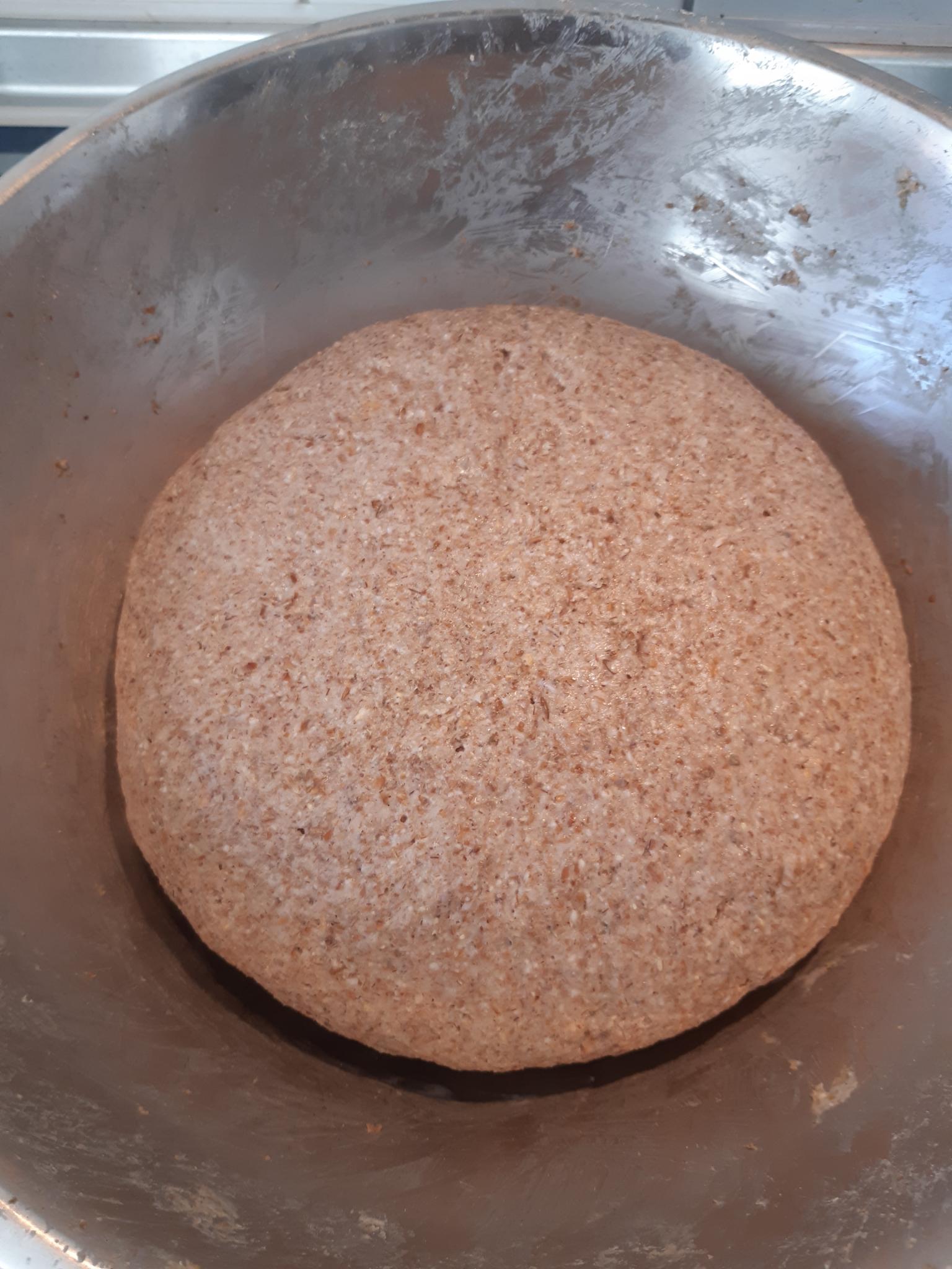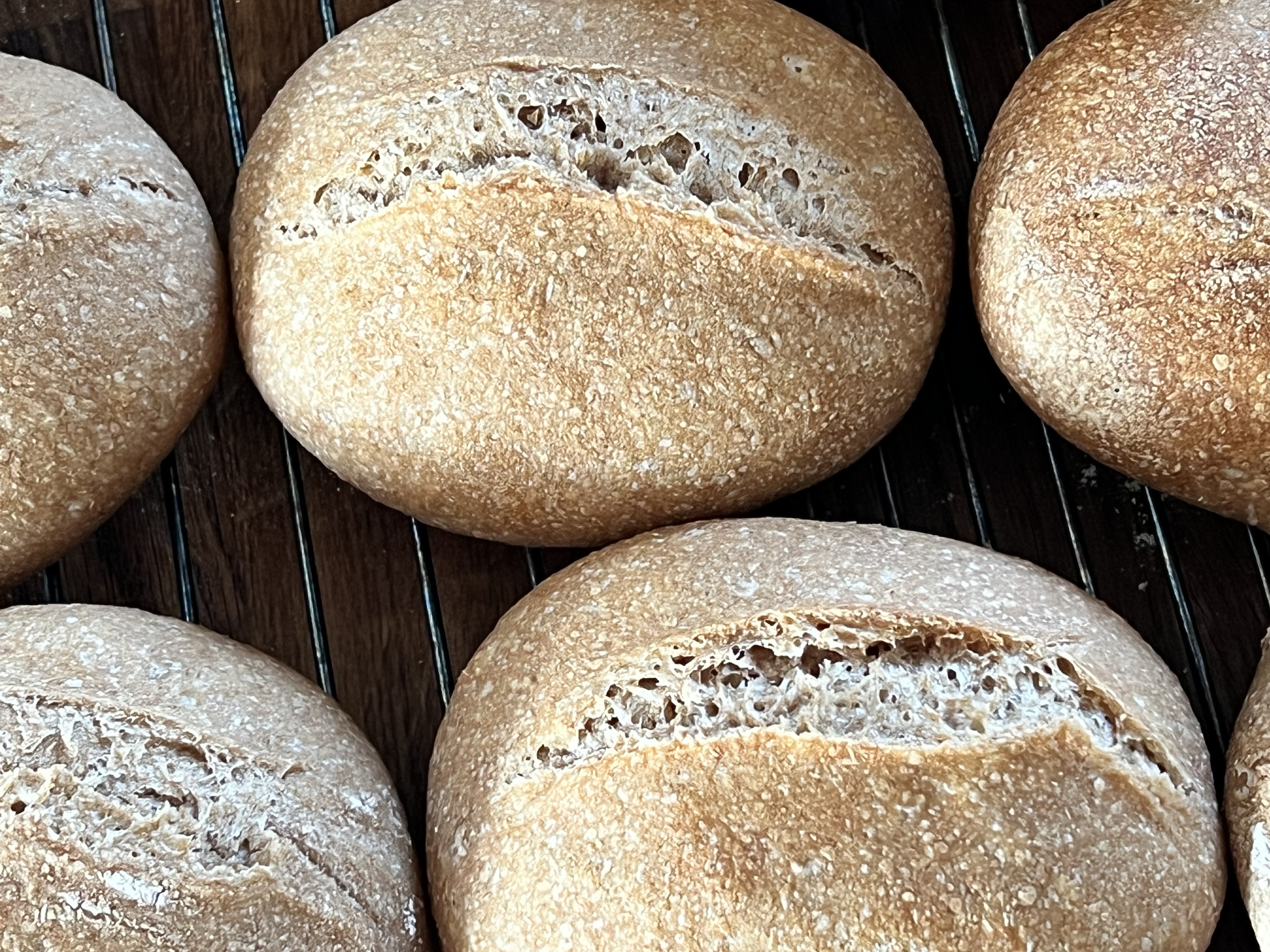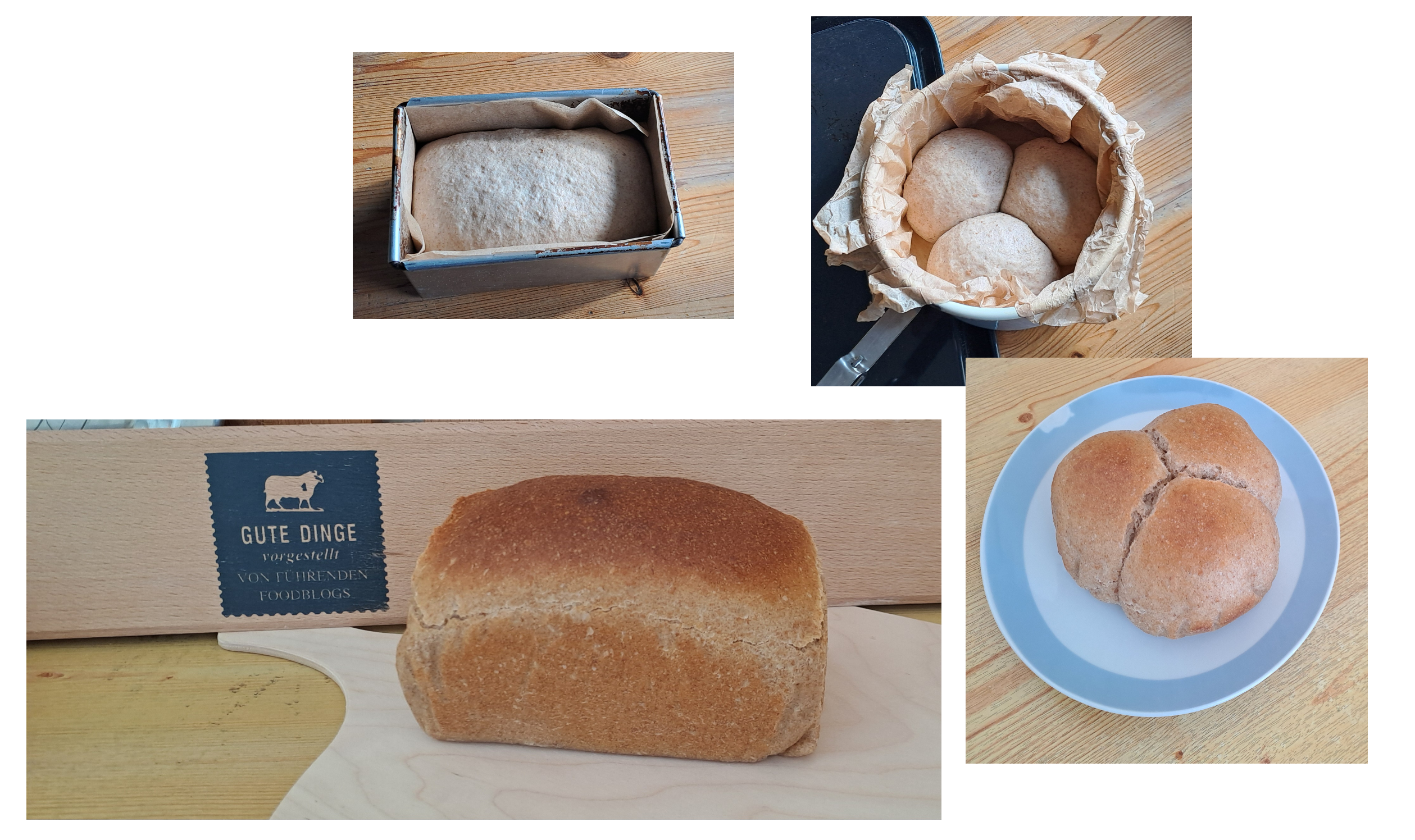 Und nochmal das schöne Vollkorntoast, halbe Menge. Diesmal ohne Deckel gebacken, und aus dem Restteig noch Brötchen geformt. Ein bisschen helles Mehl musste ich untermogeln, habe mich aber sonst ans Rezept gehalten 😇