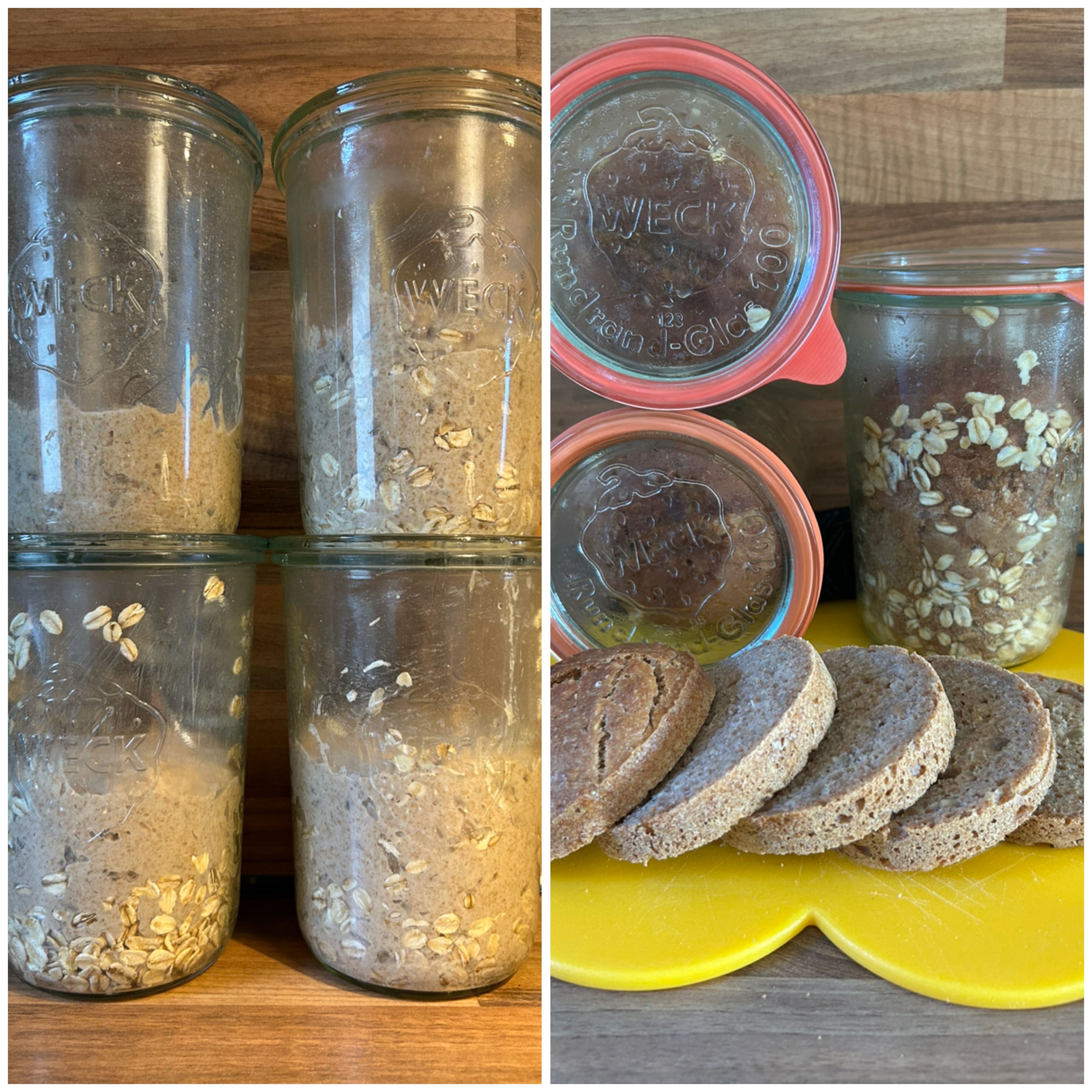 Das Ausstreuen mit Haferflocken hat nicht wirklich geklappt, die Brote rutschen aber trotzdem gut aus dem Glas (beim nächsten Mal nehme ich nur Butter).