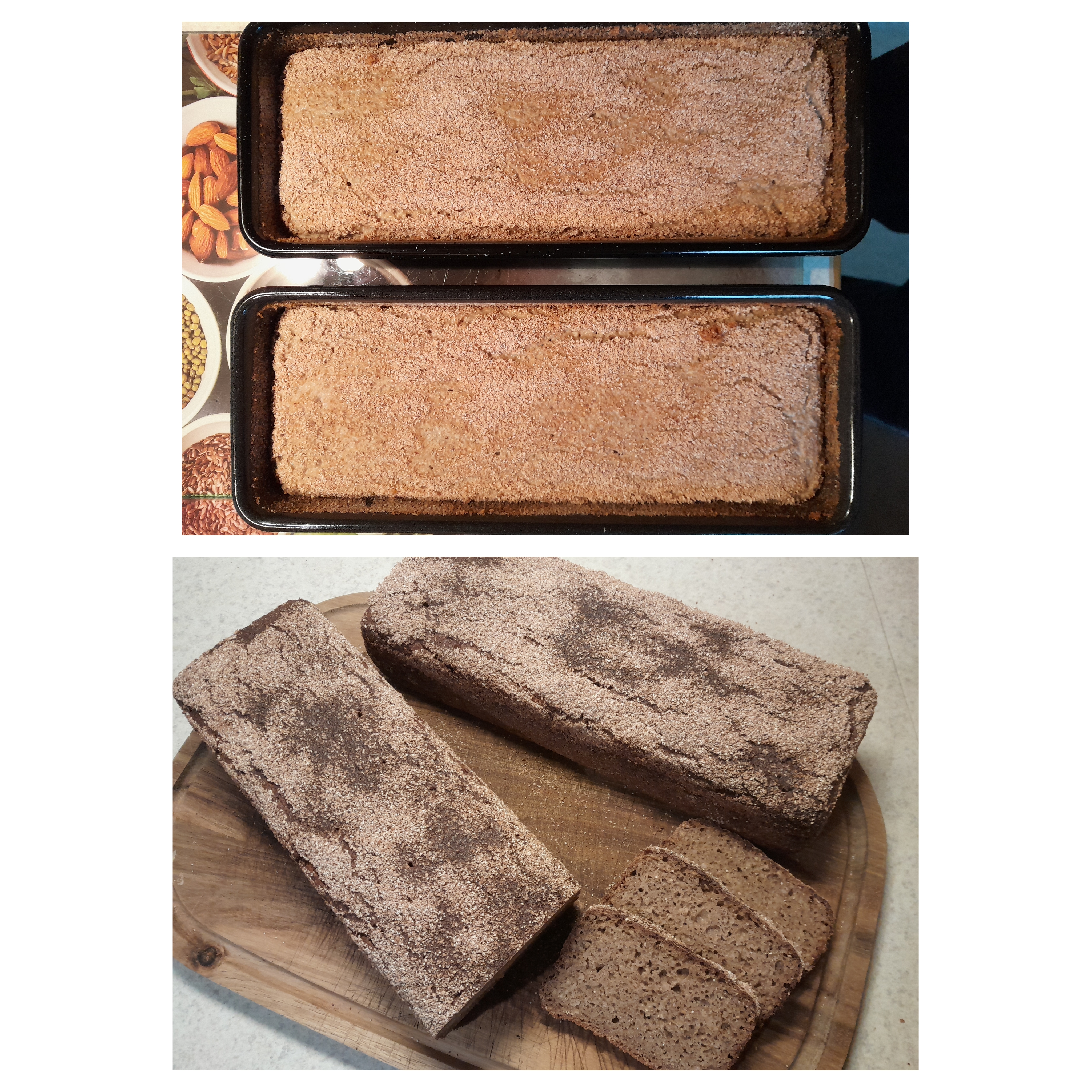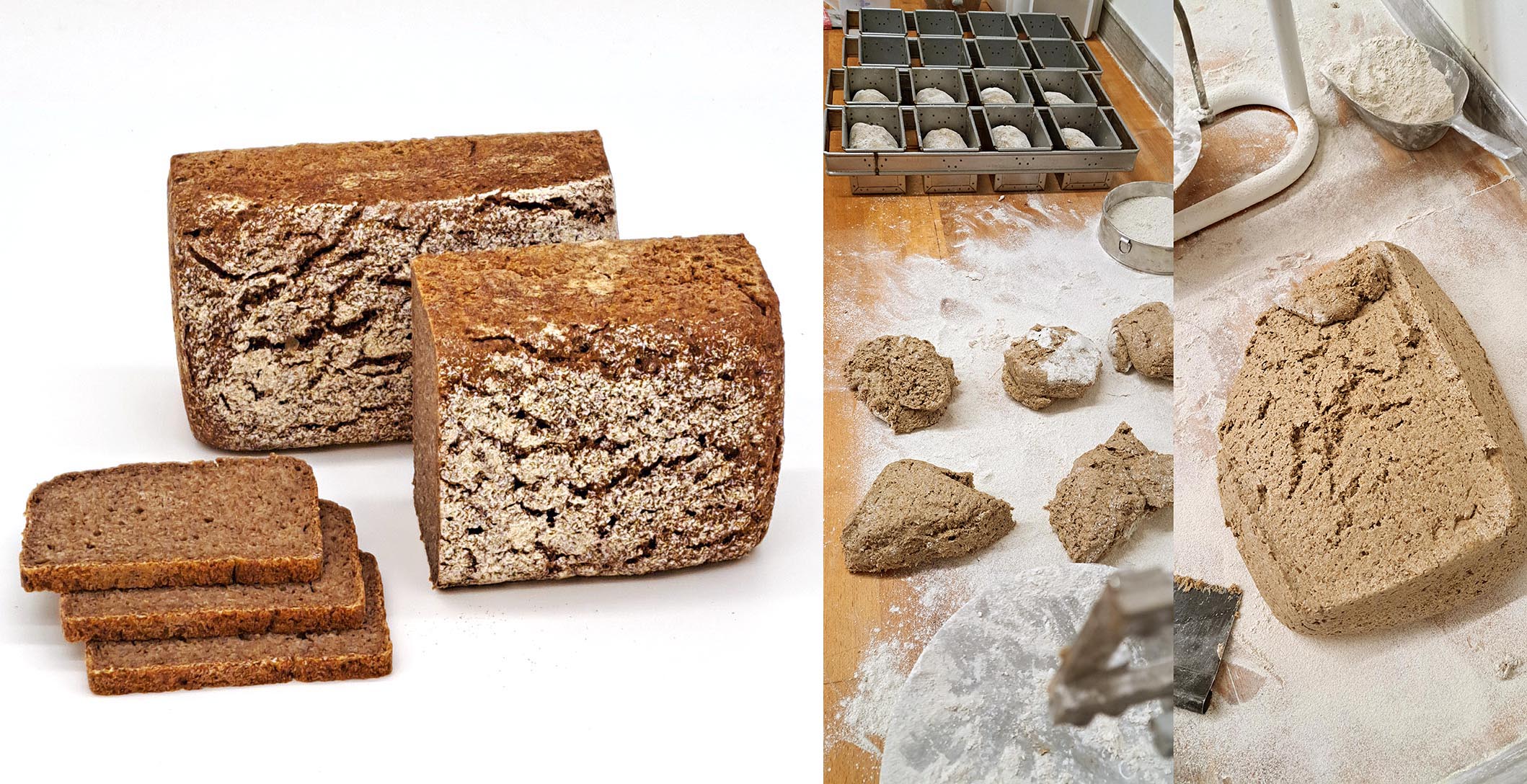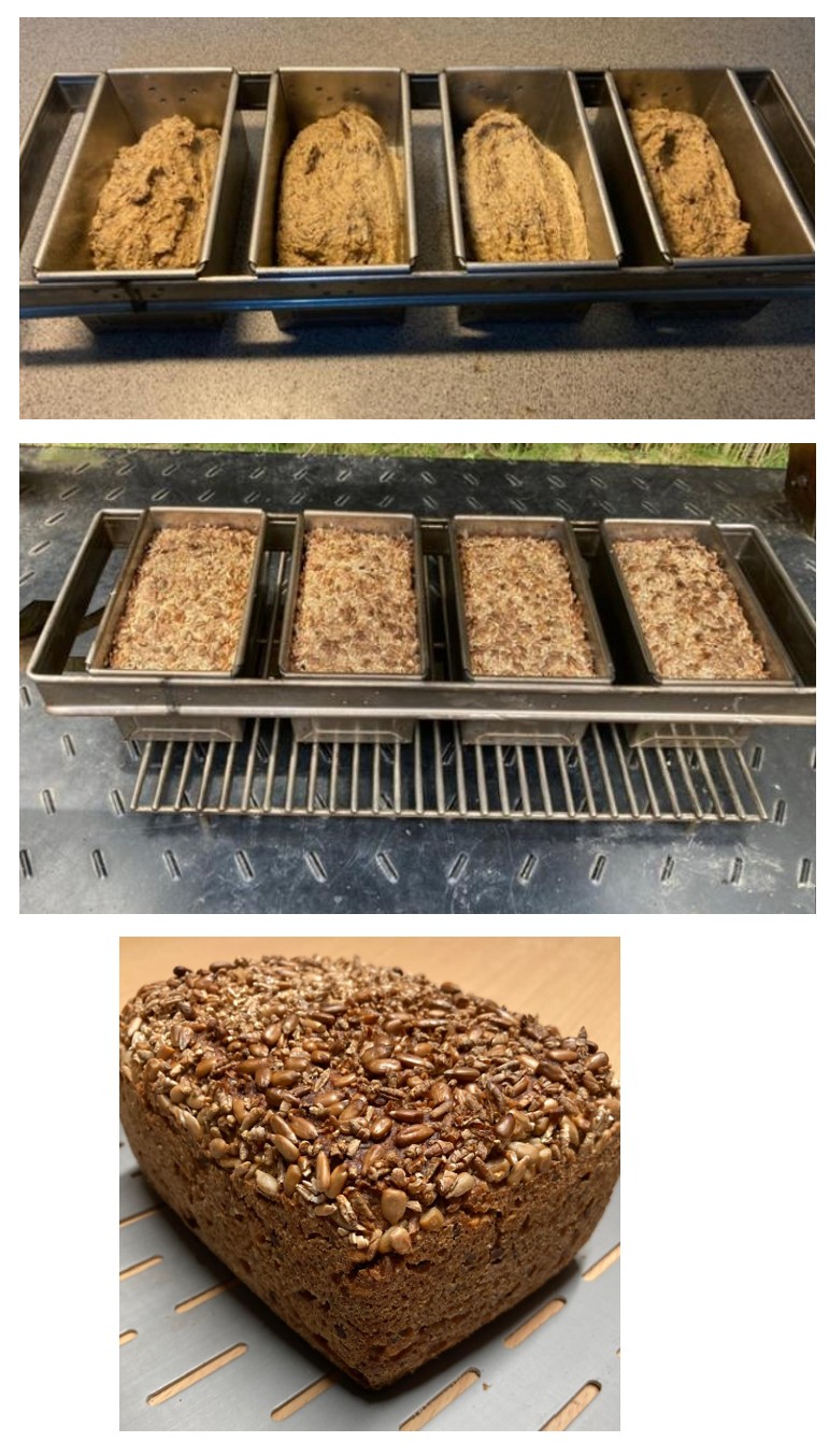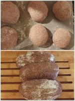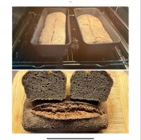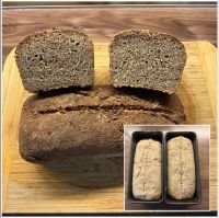 Roggenkorn gebacken. Der Teig in der Form und dann das fertige Brot.
