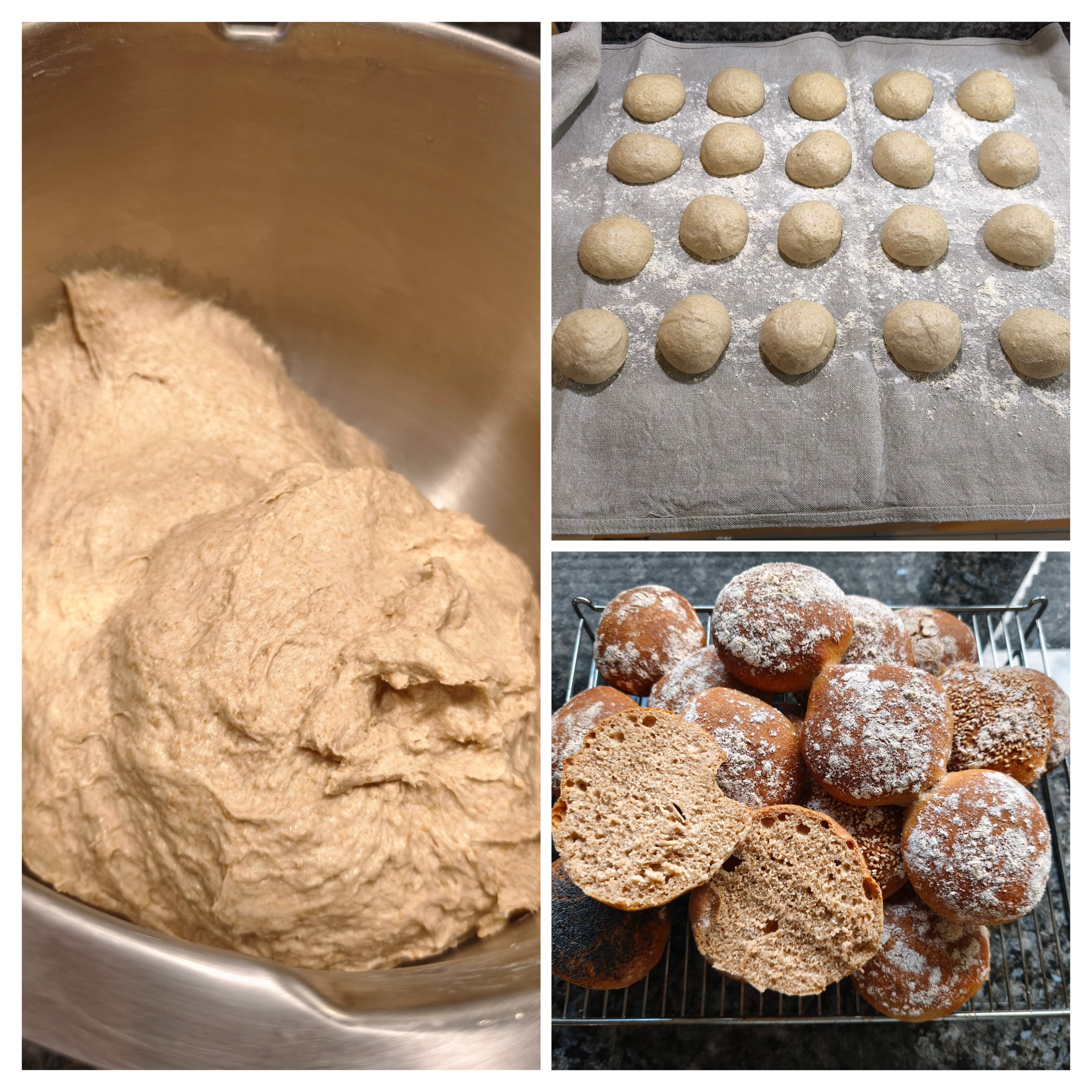 Der Teig sah Erfolg versprechend aus, der Fenstertest 1a. Aber leider sind die Brötchen beim Backen nicht aufgeplatzt und die Krume ist eher fest und nicht, wie erhofft, wattig weich.