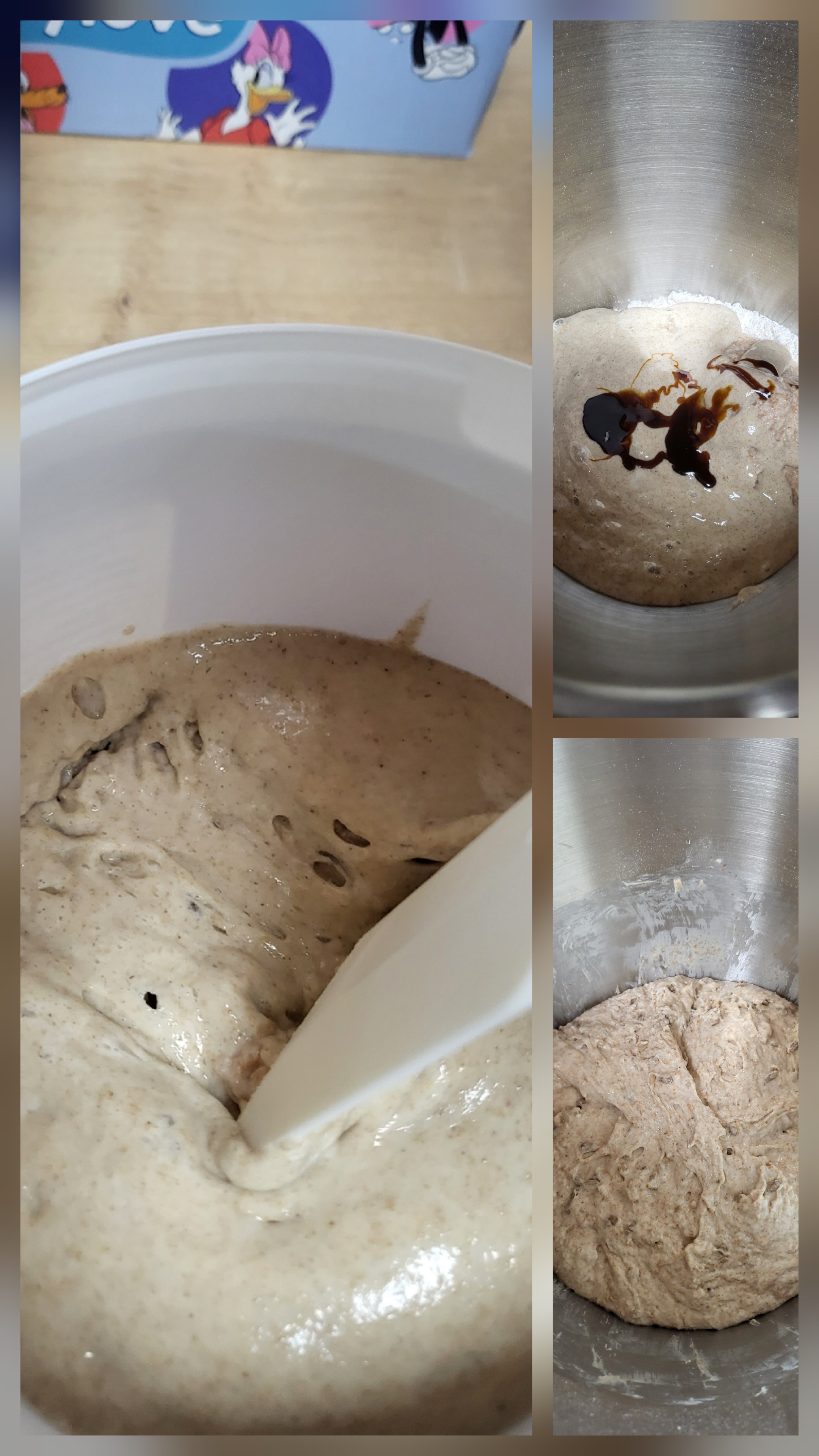Foto 1 mit Vorteig und den anderen Zutaten. Wir nehmen Rübenkraut anstelle von Honig.