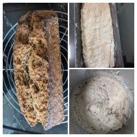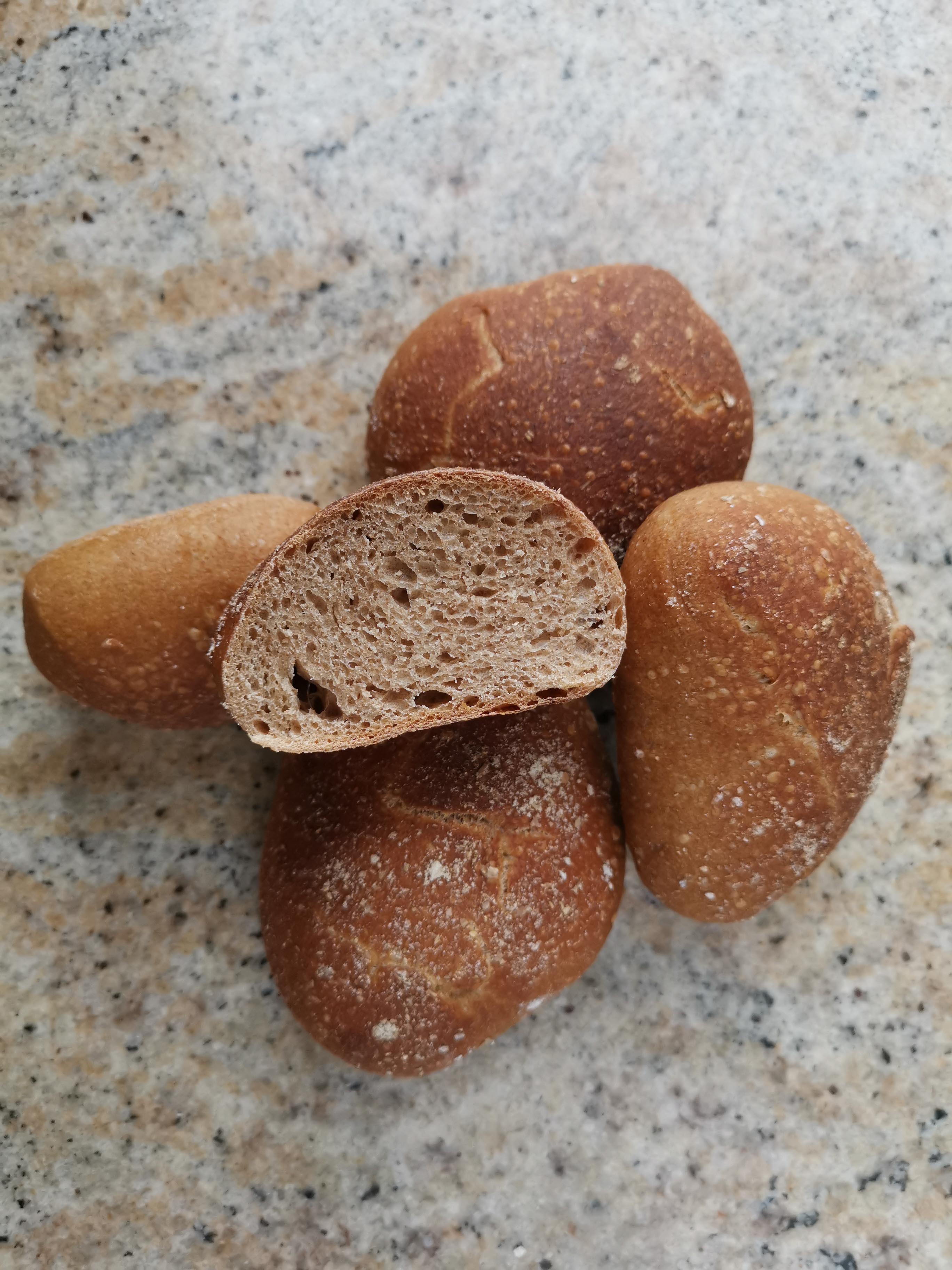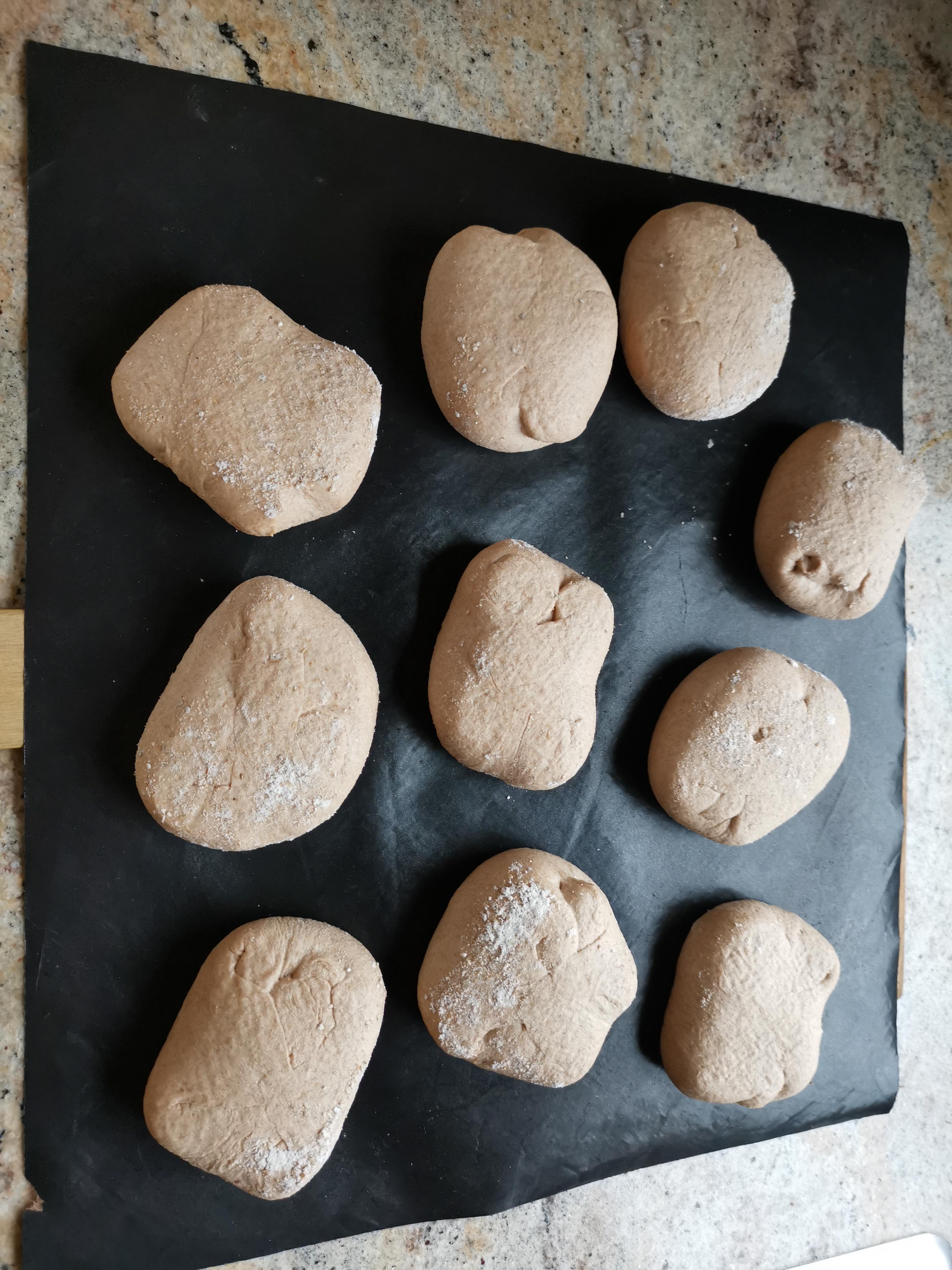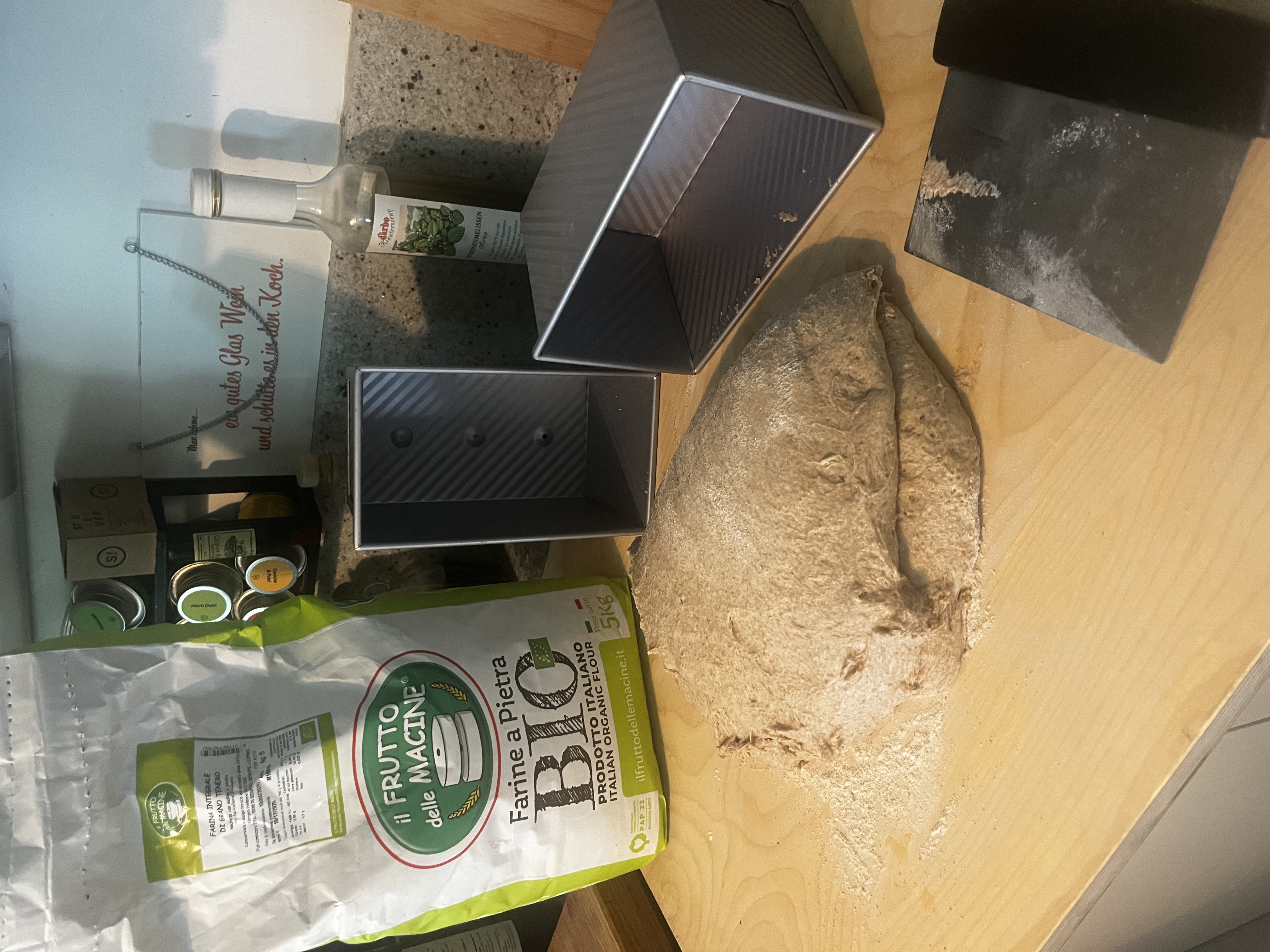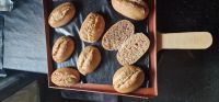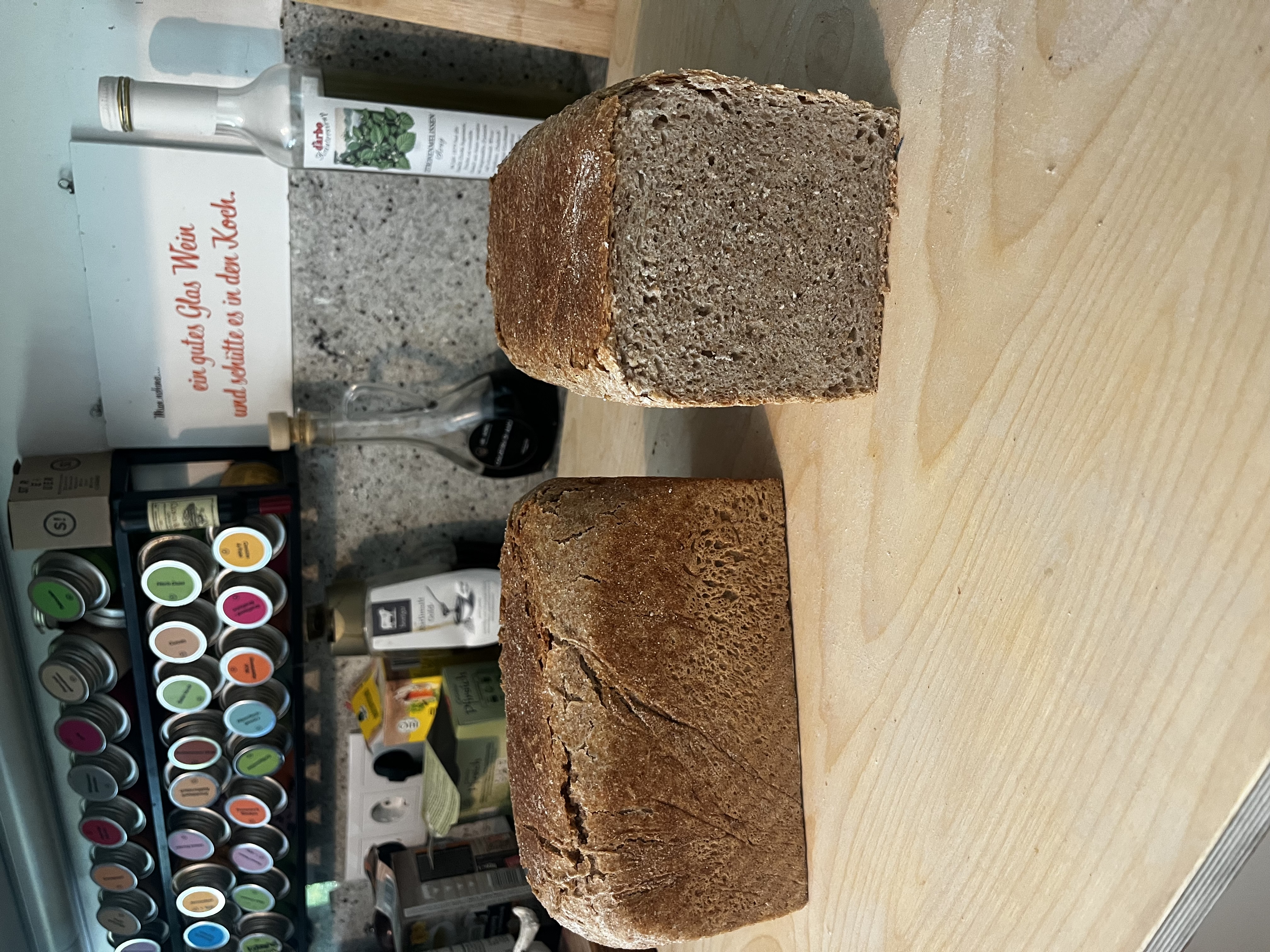 Hab die Dinkelgold gebacken. Lief mal garnicht gut. Erst waren Mehl Käfer in meinen tollen Altrubin Dinkel. Also nochmal los Dinkel holen. Dann war ich spät dran, totales Chaos in der Küche und 4 Sachen gleichzeitig zu tun. Hab mich für Übernachgare entschieden. Natürlich am nächsten Tag Übernachgare. Also nochmal geformt. Und das ist jetzt daraus geworden. Aber schmecken tun sie echt gut.