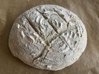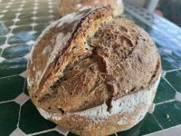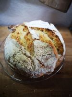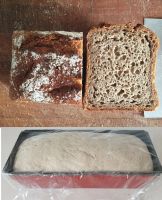 1 Foto vom Teig (im Kessel oder auf dem Tisch) und 1 Foto vom fertigen Brot.