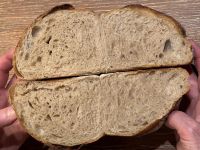 leider ist mein Brot nicht so gelungen. Es sieht aus wie ein Regenwurm🙄 Da mein Teig so weich war (hab für mein Mehl zu viel Wasser genommen) , wollte ich ein Wurzelbrot aus zwei Strängen formen. Das war wohl keine gute Idee, denn das Brot hat Wasserstreifen bekommen und ist sehr kompakt. Es stand zu lange auf der Gare, weil der Ofen belegt war. Der Geschmack ist ansonsten prima.