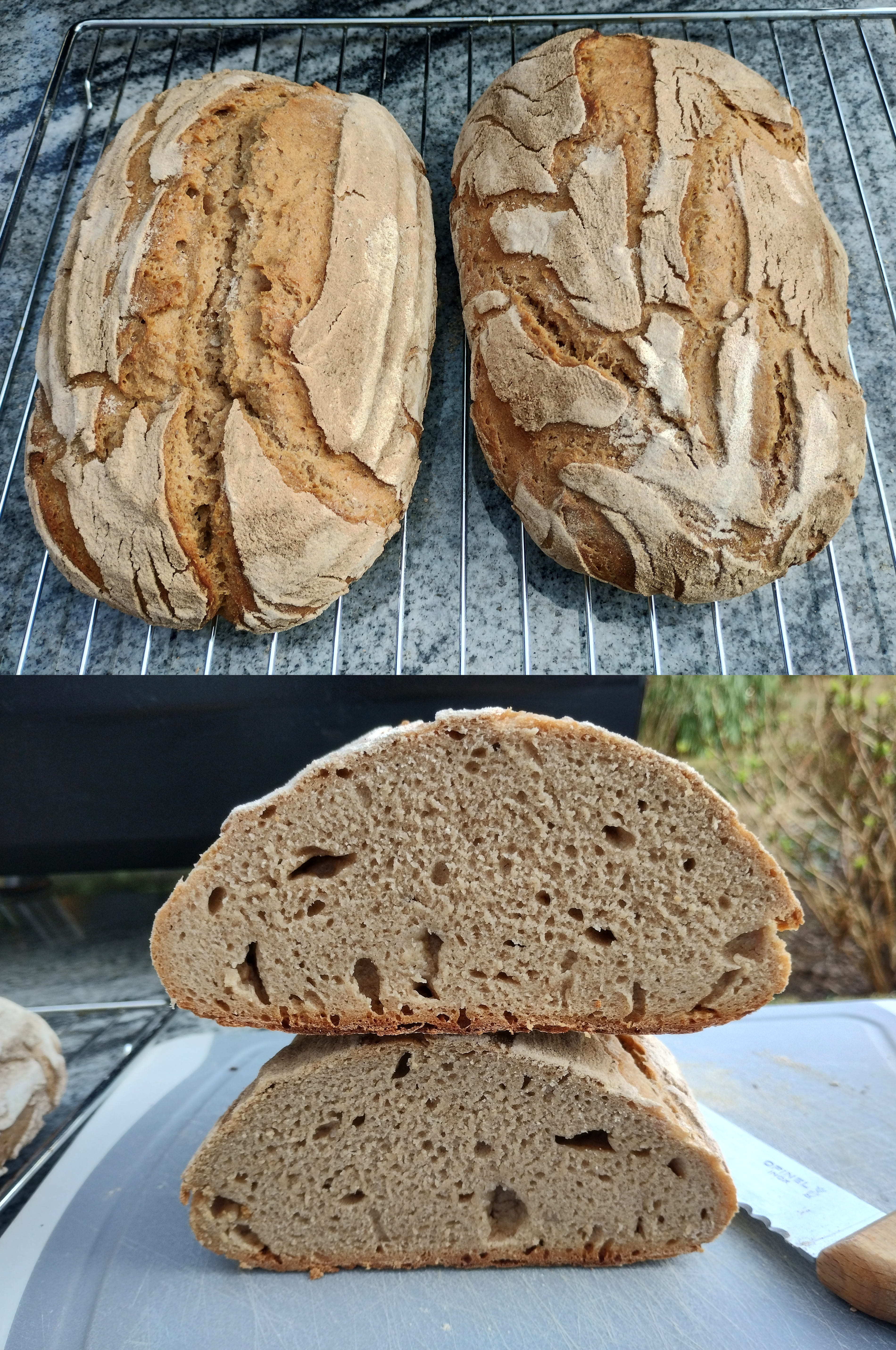 War aber nicht so. Die zwei Laibe hab ich nacheinander gebacken, der zweite war wohl schon etwas weit, trotz Kühli parken, und würde besonders flach. Aber dafür ist er schön eingerissen. Ich hoffe innen passt’s auch. Ich hab’s noch nicht angeschnitten.