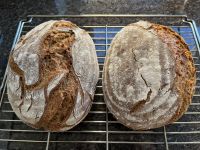 Sobald die volle Gare erreicht ist, die Brote in den auf 240 °C vorgeheizten Backofen einschieben und kräftig schwaden. Nach 5–7 Minuten den Schwaden ablassen und die Ofentemperatur auf 200 °C reduzieren. Die Gesamtbackzeit beträgt etwa 70 Minuten. Die Brote sind fertig, wenn eine Kerntemperatur von mindestens 98 °C erreicht ist.