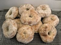 - Der geformte Bagel wird nun sofort auf ein Blech mit Backpapier abgesetzt (sollten die Bagel direkt auf Stein gebacken werden, so werden diese auf bemehlten Leinentüchern abgesetzt.