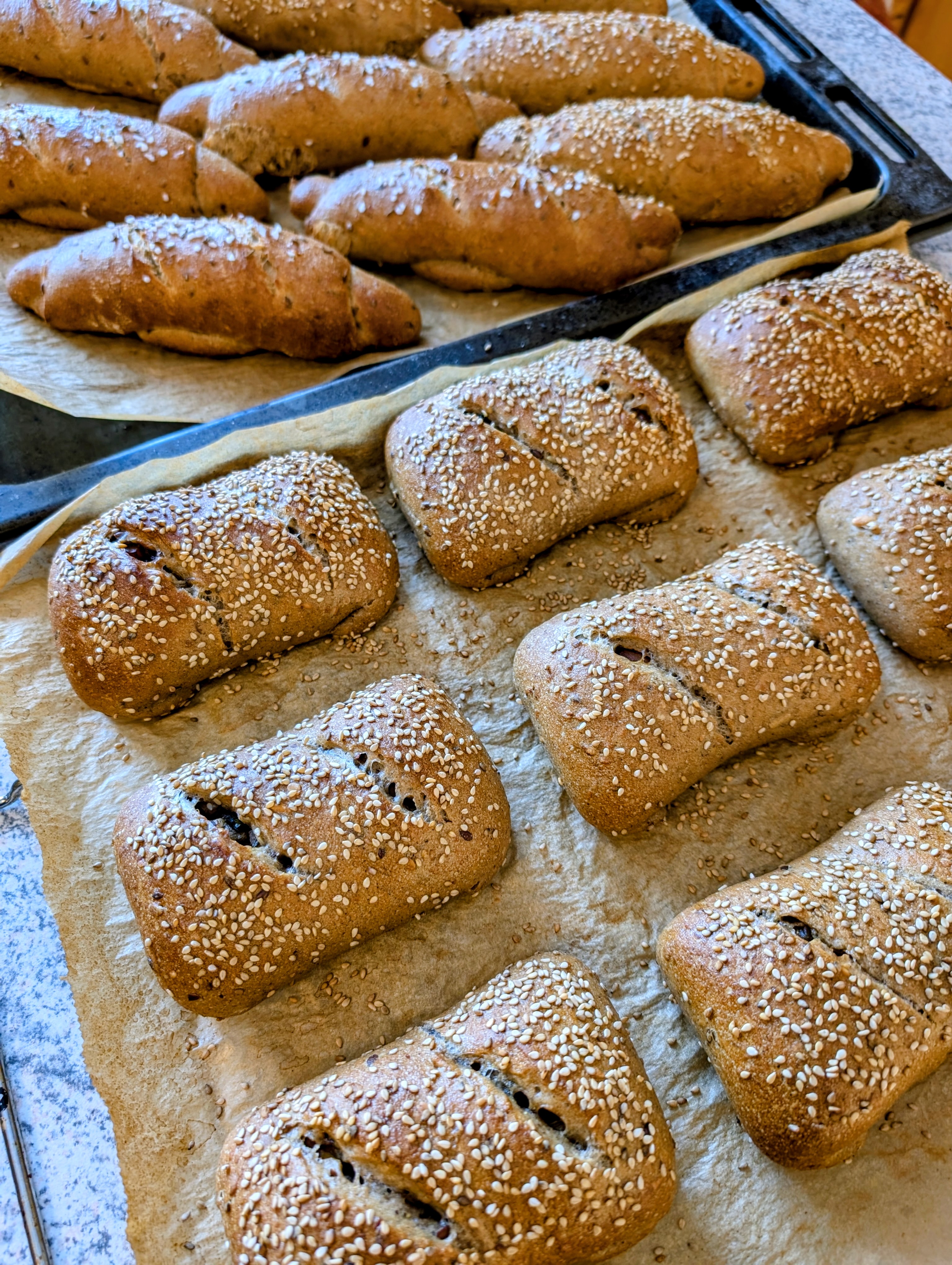 - Anschließend stehen die geformten Teiglinge 45 Minuten auf der Gare. Erst kurz vor dem Backen werden die Teiglinge 2x der Länge nach geschnitten und mit Kümmel und groben Salz bestreut.