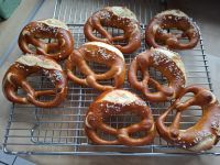 Diesmal mit 100g Teiglingen und jedes mal nur vier Teile auf einmal im Ofen auf Dauerbackfolie. Dann kann man die nach dem Laugen noch mal etwas größer ziehen.