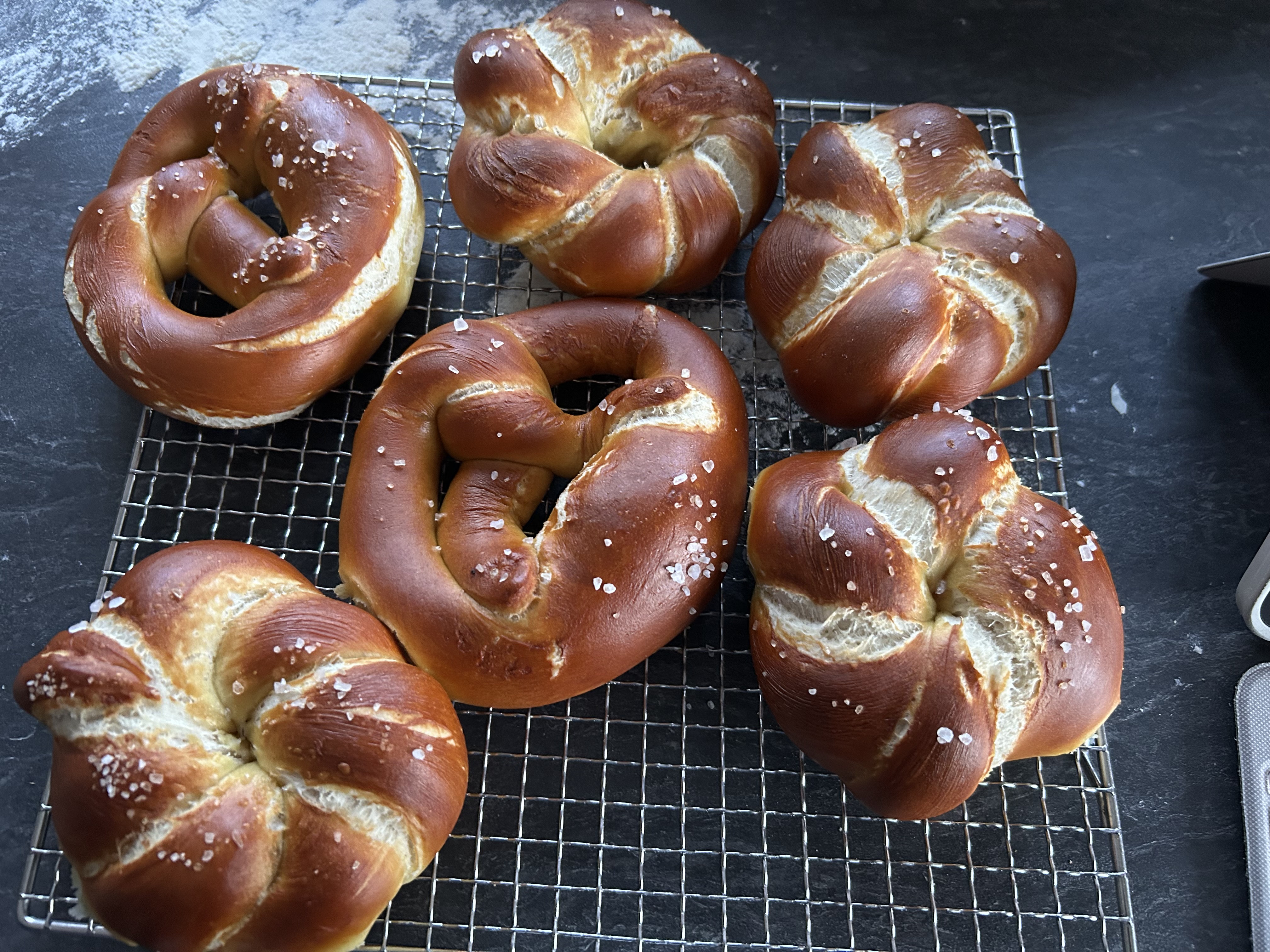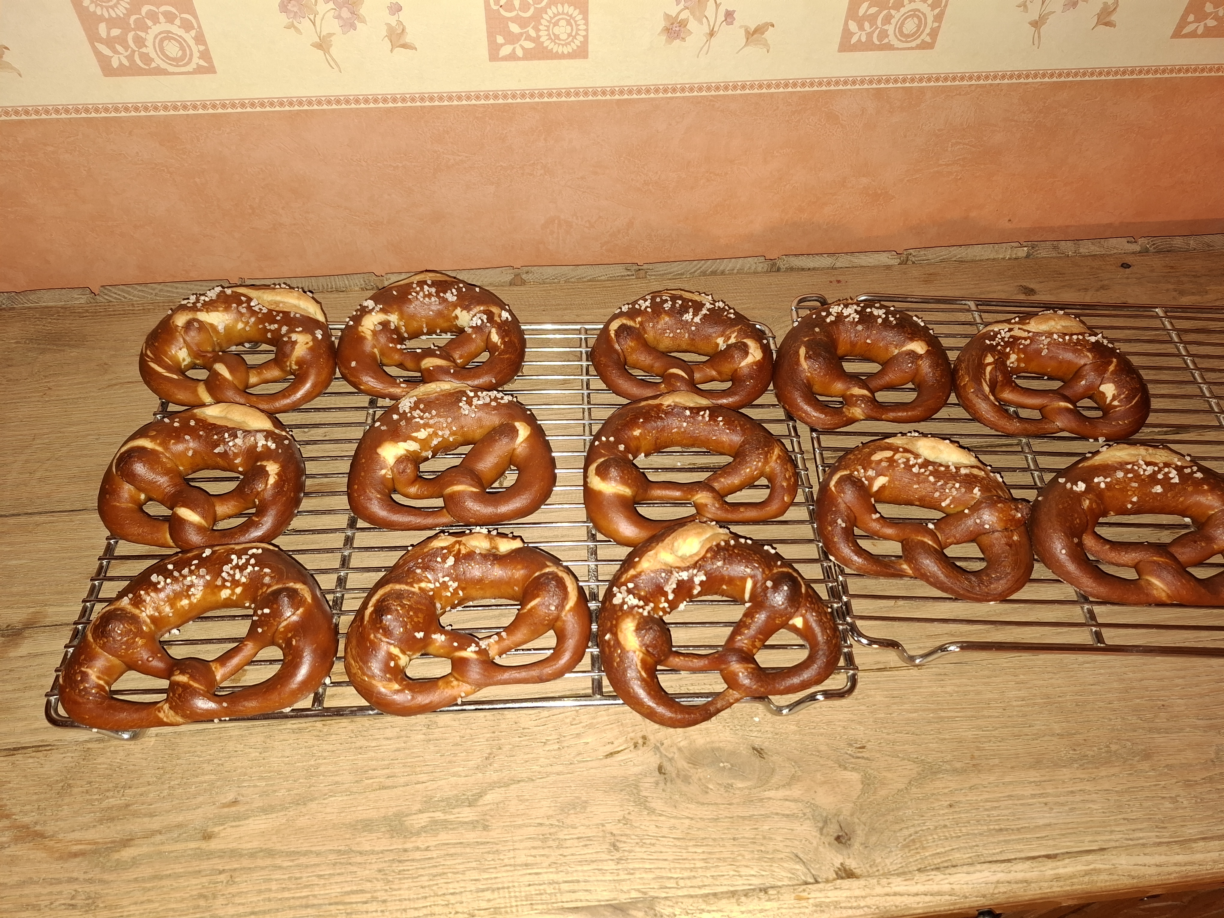 Ich brauche einfach mehr Platz auf dem Blech, dann kann ich sie noch etwas dünner machen und größer. Mal schauen, es es dann mit der Lauge klappt. Die war diesmal etwas zu warm – spannend.