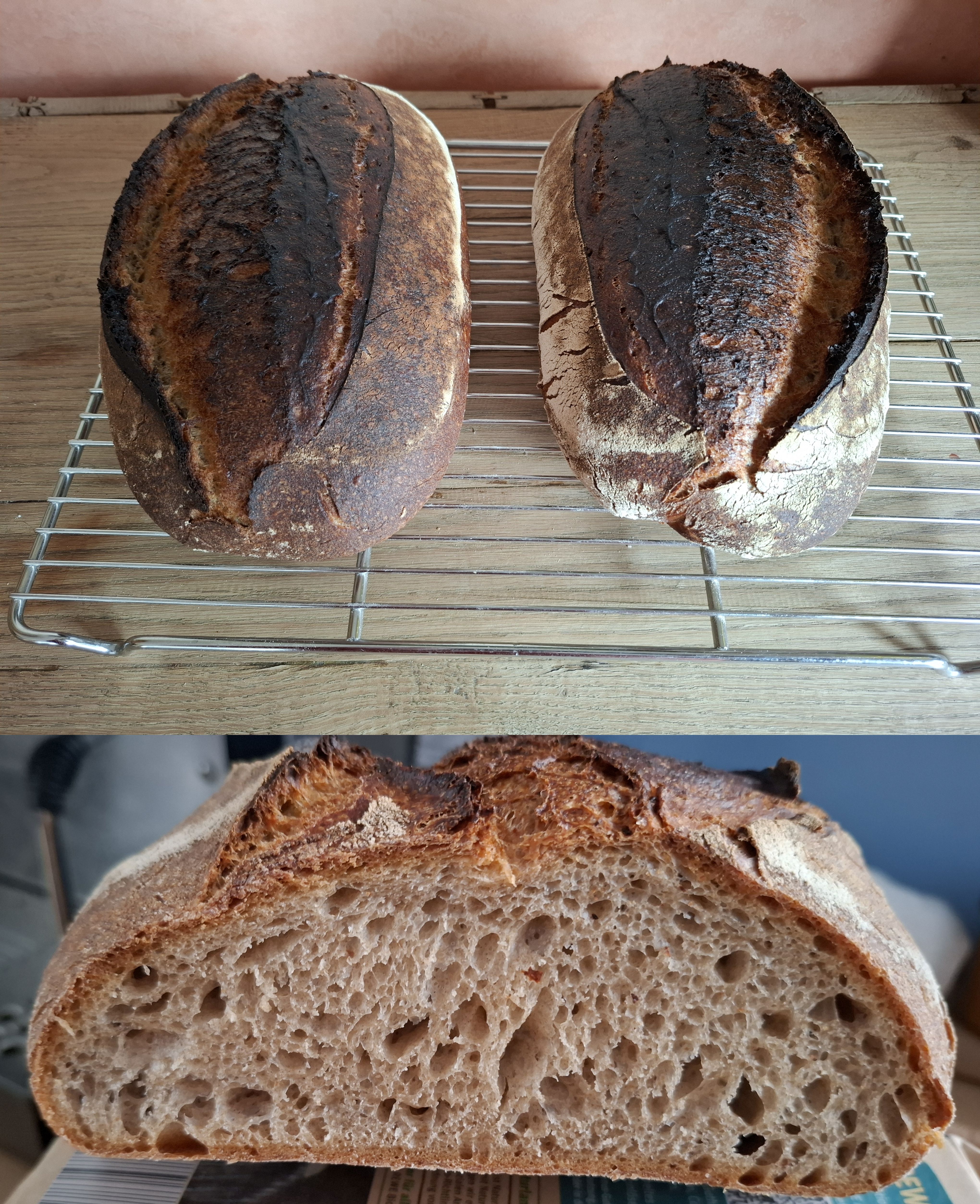 einmal – so sagt man – ist keinmal. Darum – und weil meine Liebstes das Pain Complete sofort zu ihrem neuen Lieblingsbrot erklärt hat – gleich ein zweiter Versuch. Diesmal mit doppelter Menge und größeren Laiben (ca. 950 Gramm Teigeinlage). Beim Mehl eine kleine Änderung – der Bioladen hatte grade kein Weizenvollkorn, also habe ich Dinkelvollkorn genommen. Hat alles soweit prima geklappt. Beim Backen des zweiten Laibs gab es nebenher eine kleine Katastrophe undich war gefragt. Darüber habe ich vergessen, den Ofen runterzustellen. Dafür habe ich das Brot schon nach knappen 60 Minuten rausgenommen.
