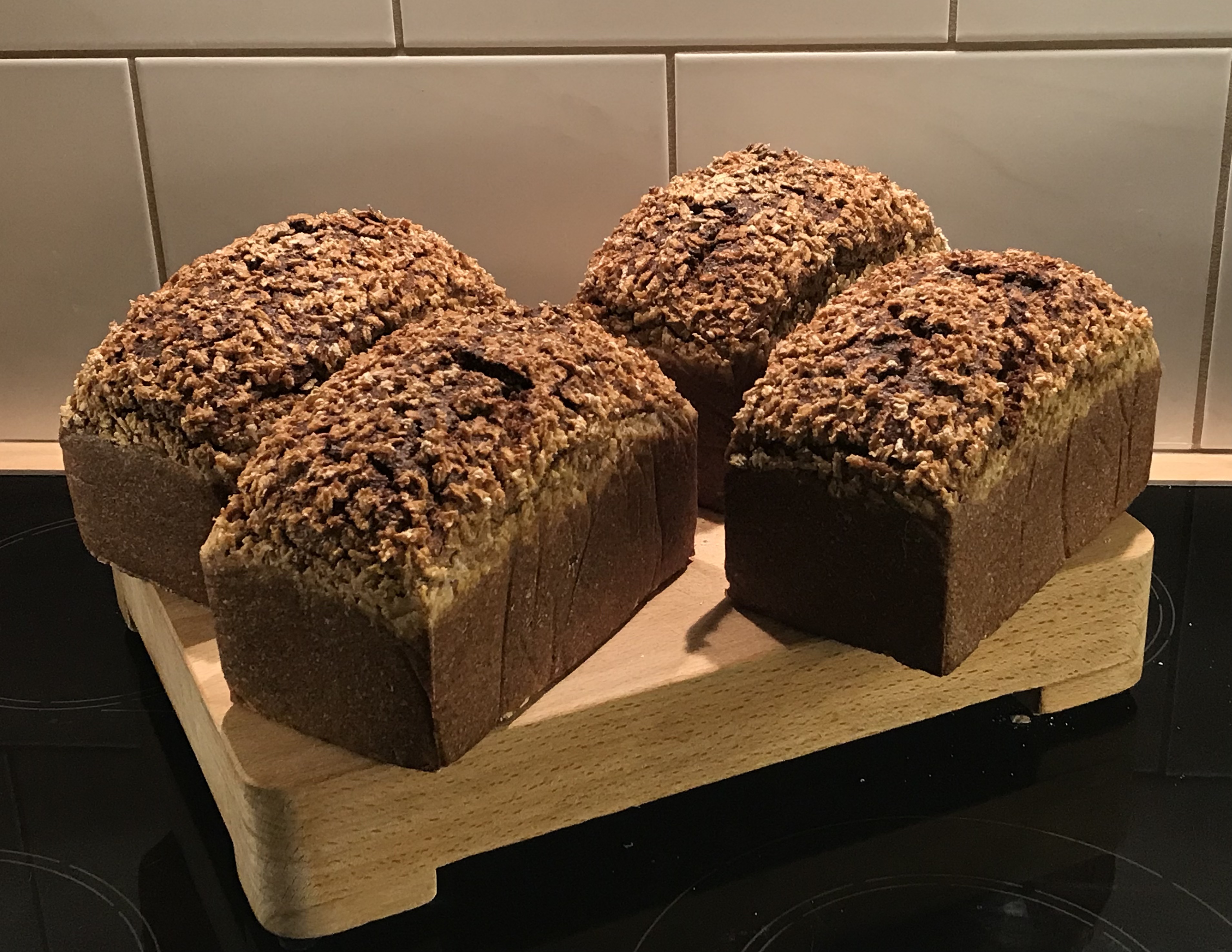Die Küchenmaschine kam gut mit der üppigen Zuladung zurecht und der Backofen spielte ebenfalls mit. Das Ergebnis 4 Nordfriesenbrote mit TE je 1 kg, hergestellt mit selbst gemahlenem bzw. geflocktem Getreide und fermentiertem Backmalz.