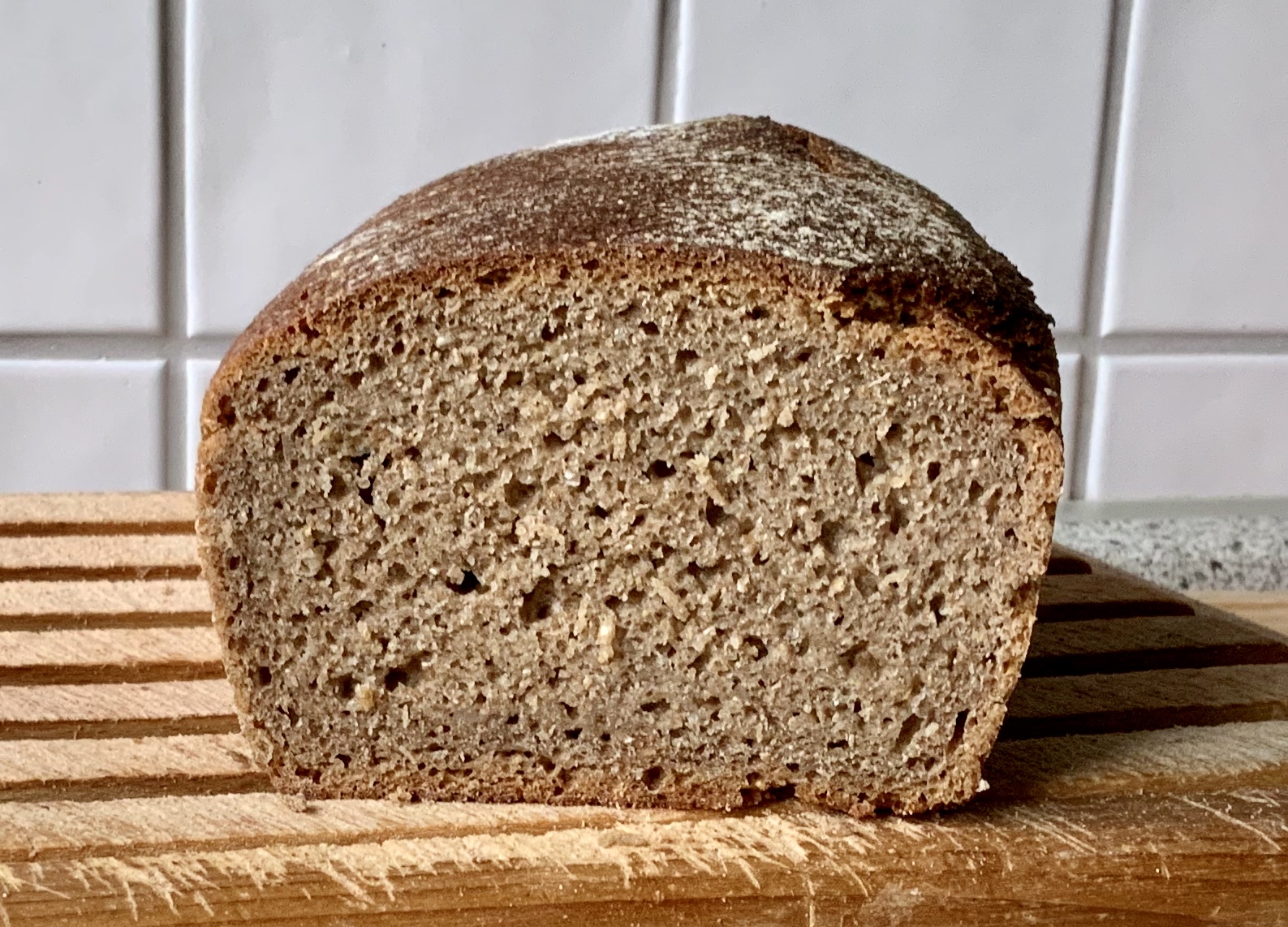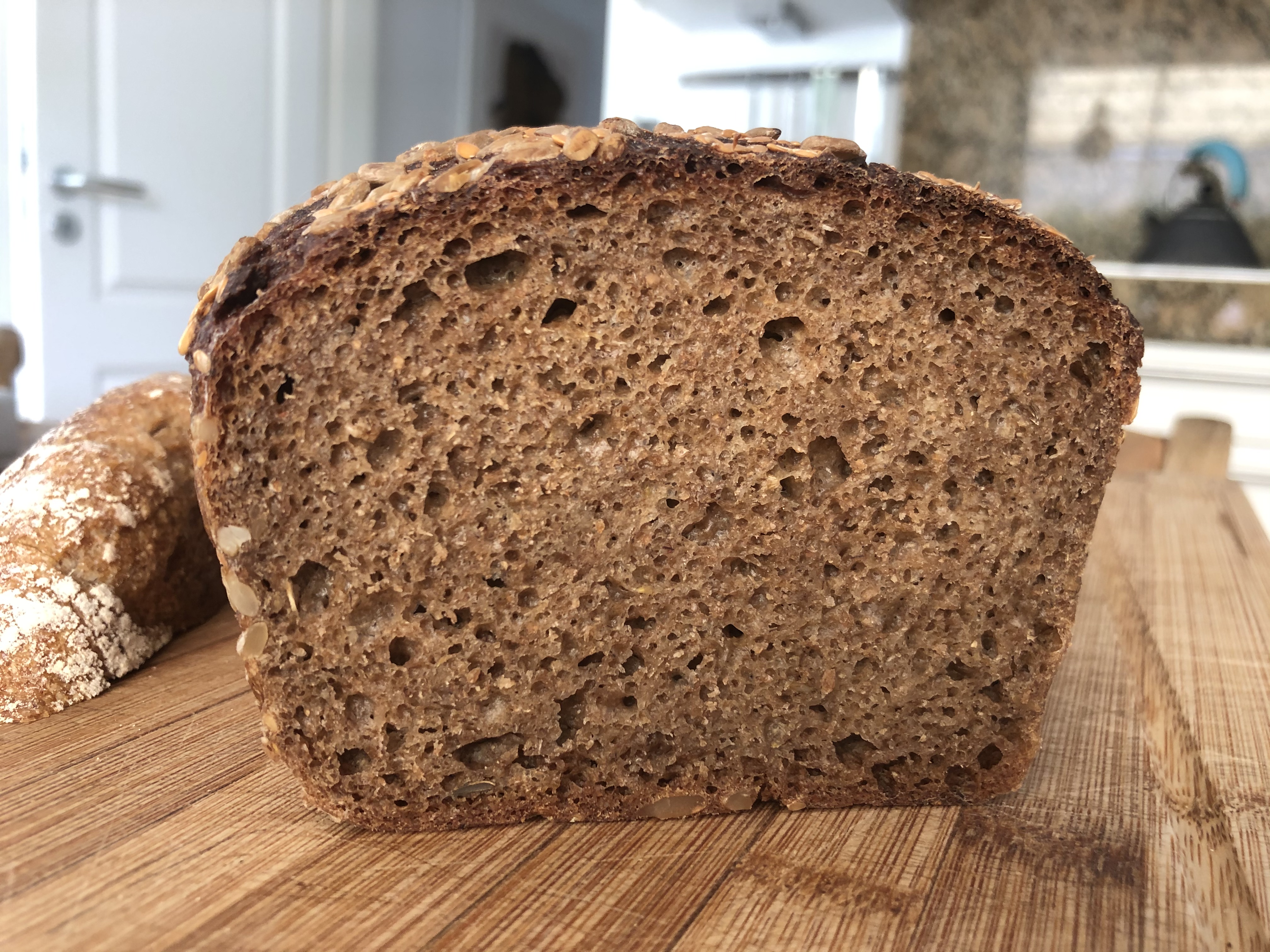 Ich habe das Brot am Sonntag gebacken und heute Morgen angeschnitten. Es ist leider nicht so locker, wie ich es erwartet habe. Geschmacklich ist es großartig.