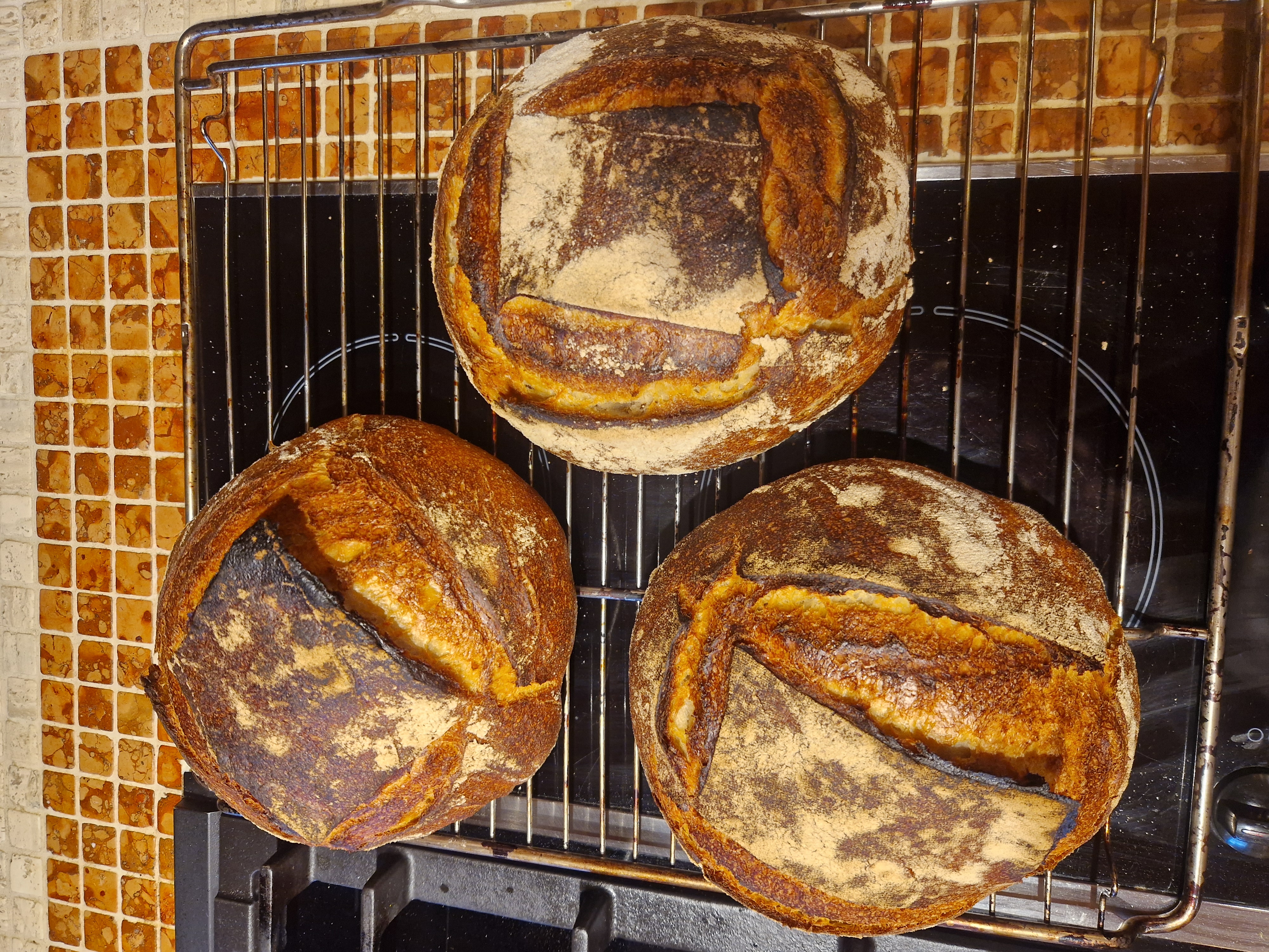 Ich habe drei Brote gebacken, eins oval, eins rund und eins eher dreieckig. Insgesamt sehr wild.