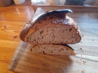 Gebacken mit 200 Roggenanstellgut (teils schon 2 Wochen alt), Weizen 812 und 550. Nach 19 Stunden Stückgare im Kühlschrank heute früh gebacken und eines gerade verspeist zum Frühstück.