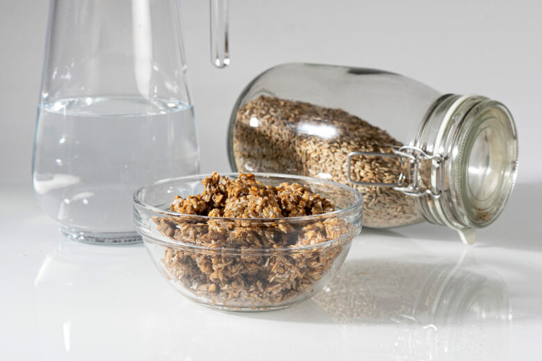 - Getreidekörner und Wasser in einem Topf aufwärmen, bis das Wasser vollständig verquollen ist.