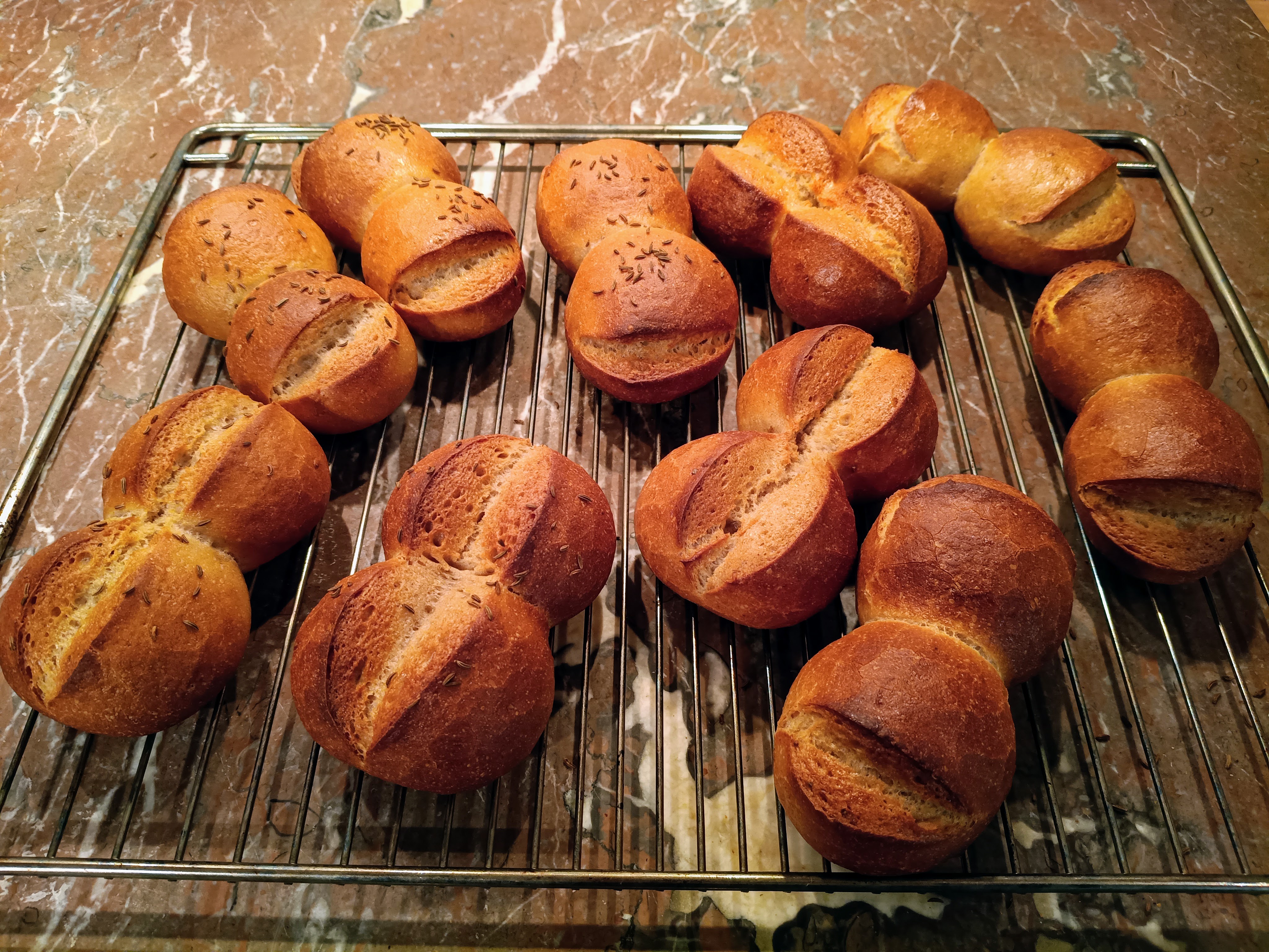 Einmal wie im Rezept als 2×50 Gramm Brötchen, finde ich allerdings nicht so schön und einmal mit 90g TE als Wachauer rund geschleift mit Schluss unten gehen lassen und mit Schluss oben gebacken. Kümmel hab ich weggelassen. Geschmacklich top, knusprig und Krume schön weich. Die wird es wieder geben 😋