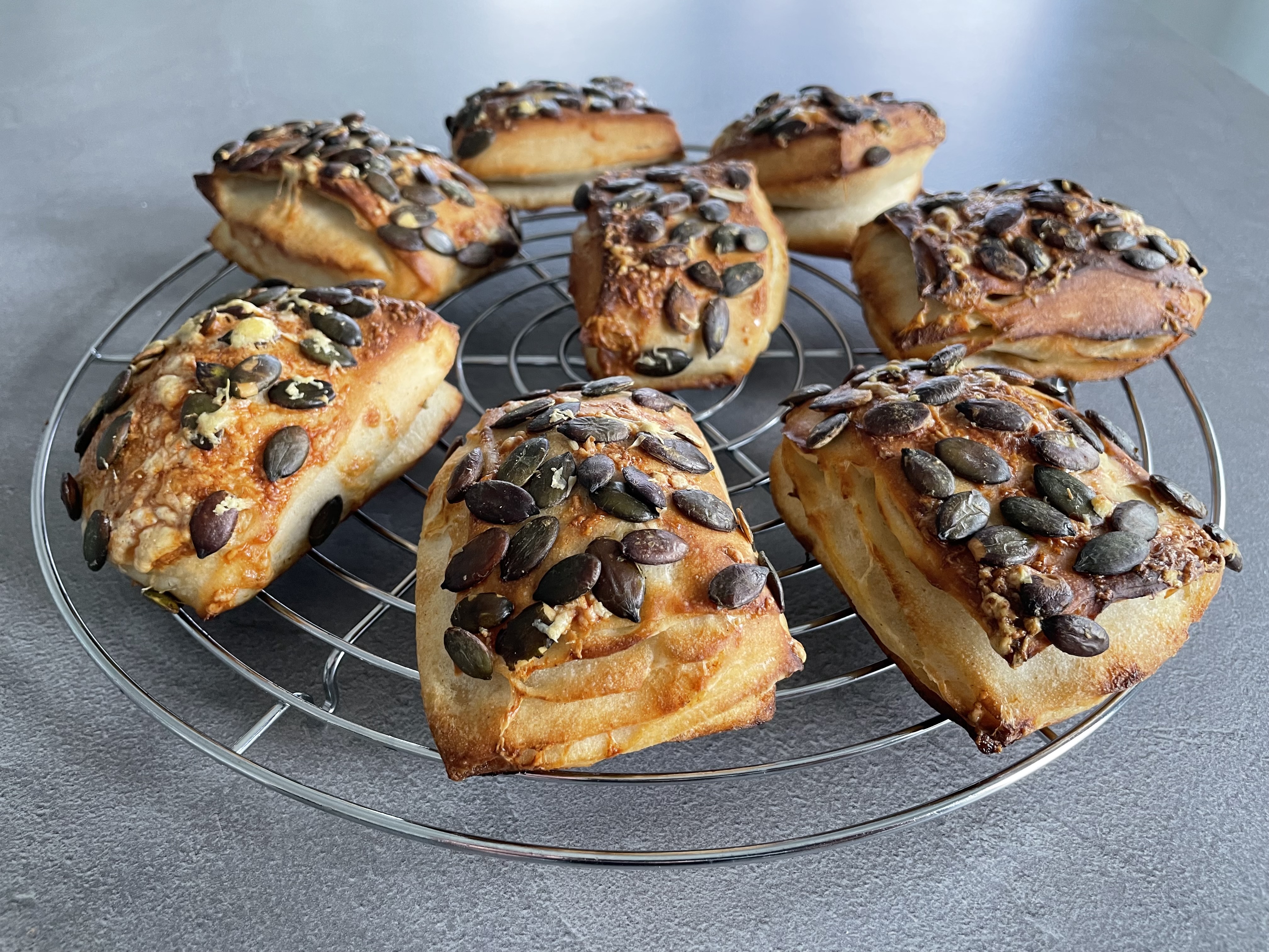 Vor dem Backen werden die Teiglinge mit etwas Wasser bestrichen und in eine Mischung aus geriebenem Käse und Kürbiskernen getunkt.