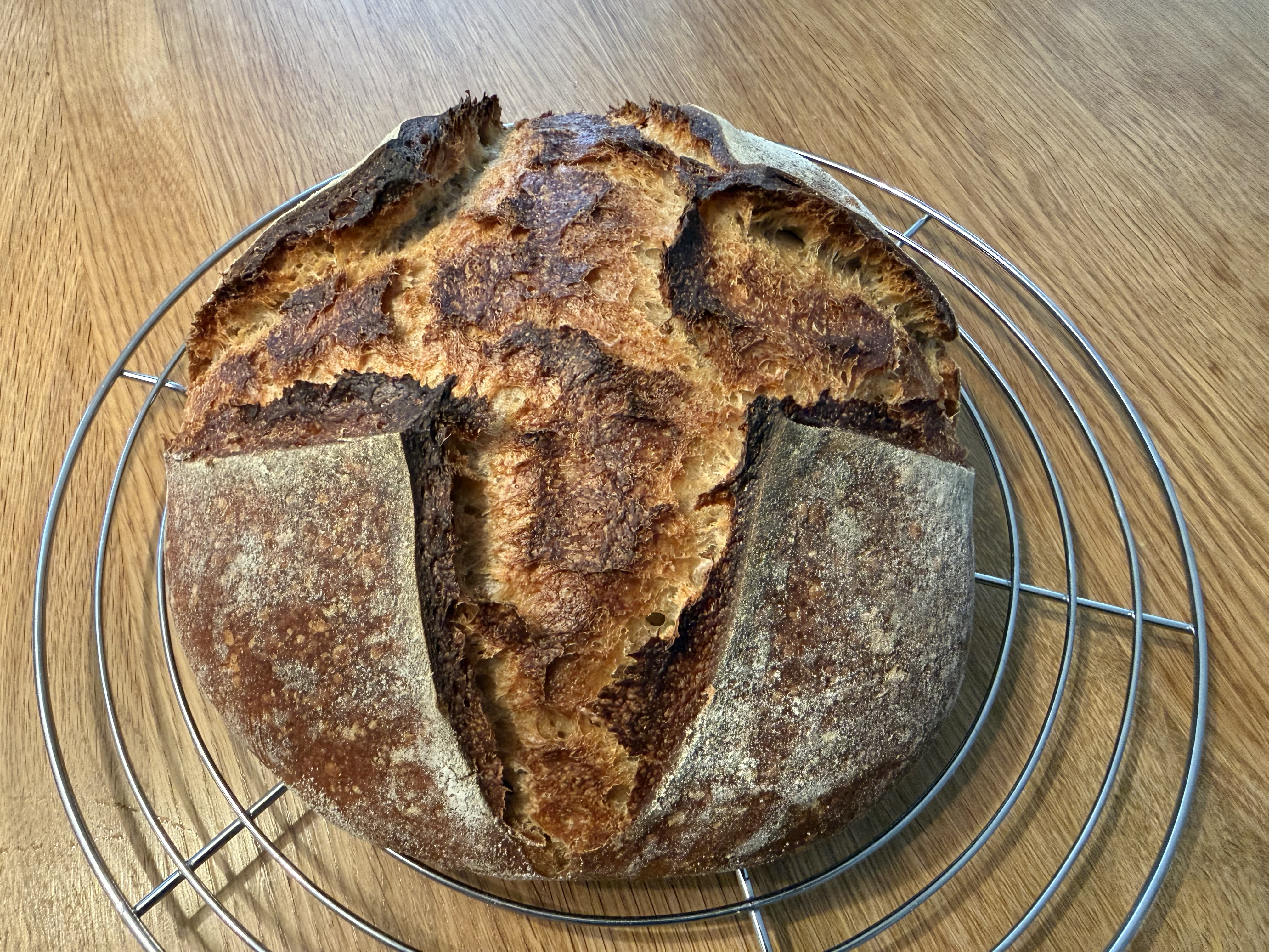 vorweg, ich war durch die Kommentare etwas verunsichert, weil es bei den einen ganz ausgezeichnet geklappt hat, bei anderen eher nicht – es war durchwachsen, wuerde ich sagen. Bis zur Aufarbeitung voellig problemlos, die Aufarbeitung selbst schwierig, weil sich der Teig kein bisschen stabilisiert hat durch das Falten, im Gegenteil. Das ist der grosse Hund hier, ich kann die guten Ratschlaege wohl beherzigen, aber nicht umsetzen, wie etwa laengeres Auskneten. Knete ich den Teig laenger, verfluessigt er sich, auch wenn die Teigtemperatur stimmmt. Raumtemperatur 30 Grad, mit jeder Minute Knetzeit wird der Teig weicher, ich hatte 26,5 Grad TT nach Ende der 3-stuendigen Gare. Nach der Aufarbeitung 1 Stunde anspringen lassen, 12 Stunden im Kuehlschrank, auch nach dem Aufschlagen schoen stabil, sodass ich mir dachte: Ab damit in den Ofen, ohne Schneiden. Dann habe ich es doch riskiert – und wieder verspielt. Der erste Schnitt, dann ist es, als ob eine pneumatische Tuer aufgeht in die Klapsmuehle fuer Hobbybaecker, pfffff. In der Sekunde hat das Luder ausgehaucht und ist in die Breite gelaufen. Trotzdem bin ich nicht unzufrieden mit dem Resultat, obwohl der Laib natuerlich hoeher sein koennte. Naechstes Mal schneide ich nicht, soll der Laib meinetwegen Krustenrisse bekommen, wo er will, es ist mir wurscht. Geschmacklich ist das Brot ganz hervorragend, ich mag diese leicht saeuerlichen Teige. Die Kruste ist wie ein Panzer, die Krume schoen weich, gebacken genau nach Rezeptangabe. Die Krume haette ich mir etwas dunkler vor gestellt, es stoert mich aber nicht.