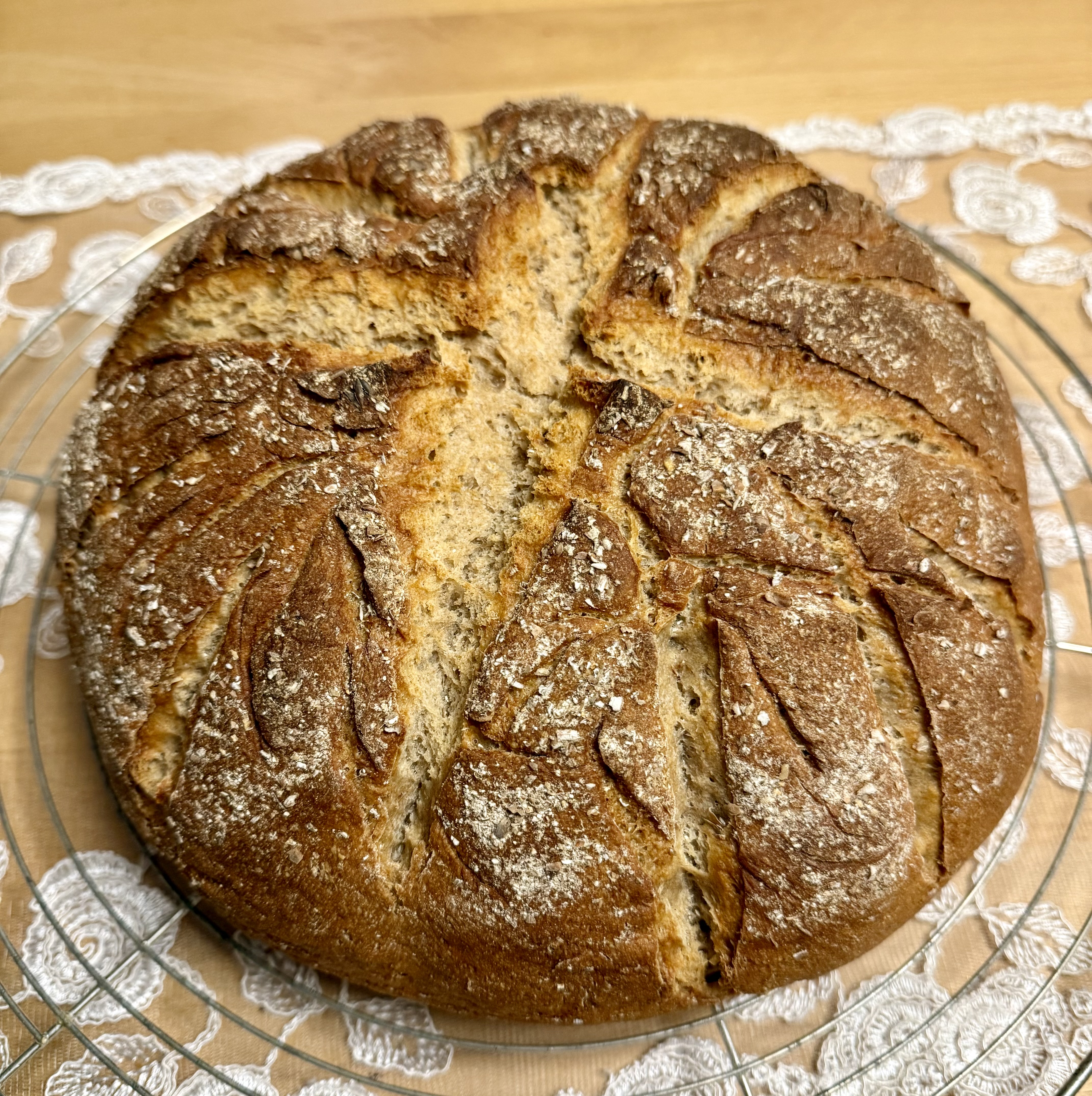 Habe mal dieses Brot versucht da ich noch Einkorn verbacken musste. Ich muss mich wieder bedanken: ein super leckeres Brot — die Kruste hat alle umgehauen. Ich muss wohl den richtigen Garpunkt erwischt haben. Ich habe es rundwirken müssen (da ich keinen langen Gärkorb habe) und war unsicher ob ich es nach dem ersten Falten dann noch mal 30 Minuten gehen lassen muss (Text und Angabe oben rechts widersprechen sich etwas). Naja, habe die 30 Minuten abgewartet, alles in den Gärkorb und knapp 8h im Kühlschrank gehabt (in dem es erstaunlicher Weise noch mal deutlich aufging). Das Ergebnis war super.