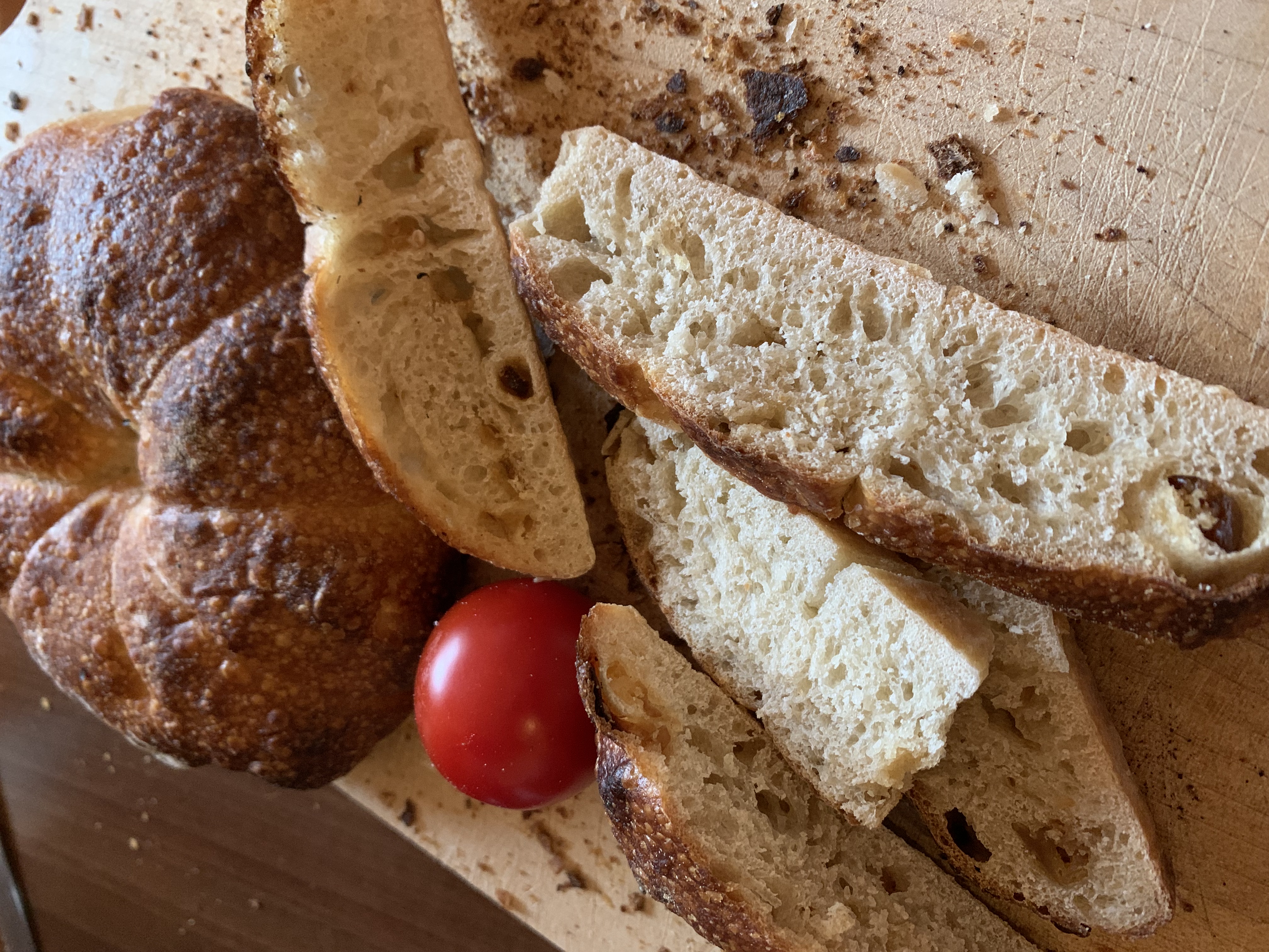 Ich habe die ersten etwas in Zeitnot nach jeweils verkürzter Stock-und Stückgare gebacken und die Beschenkten waren begeistert. Abends hab ich dann die andere Hälfte nach ca. 7 Stunden Kühlschrank und ca. 30 Minuten Raumtemperatur gebacken und die sind noch viel besser geworden. So „musste“ ich tatsächlich mal ein Bild machen und hier zeugen.