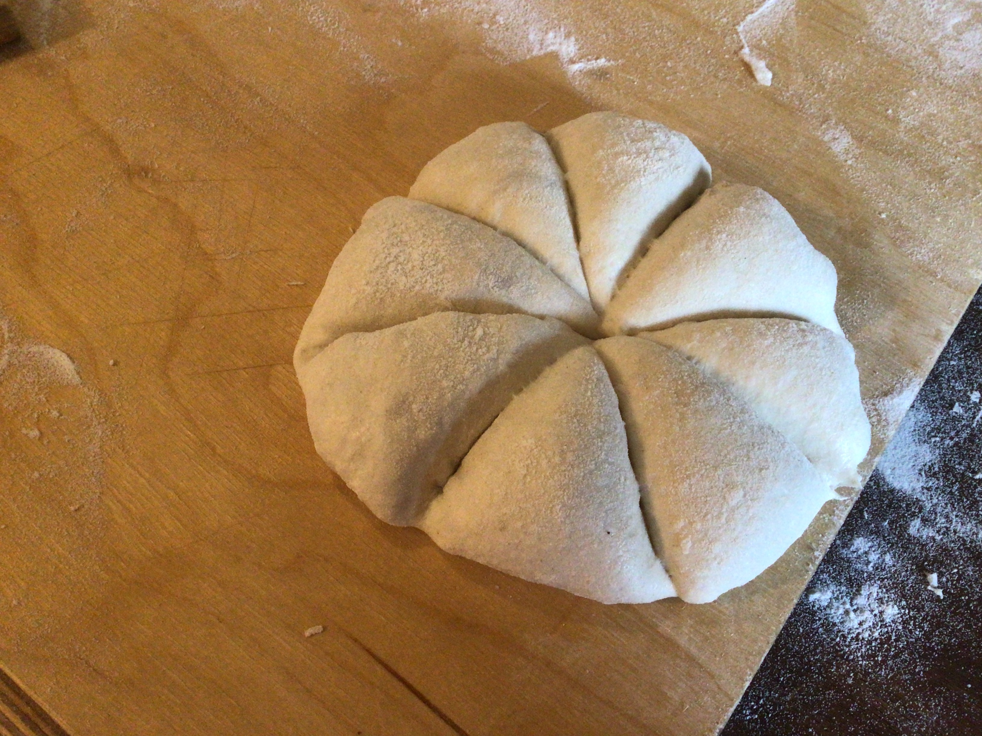 - Nach der Teigreife den Teig auf eine bemehlte Arbeitstafel kippen und in drei gleich große Stücke teilen. Diese anschließend vorsichtig zu runden Teiglingen formen, mit Mehl bestauben und zugedeckt mit Plastik oder einem Leinentuch entspanne lassen.